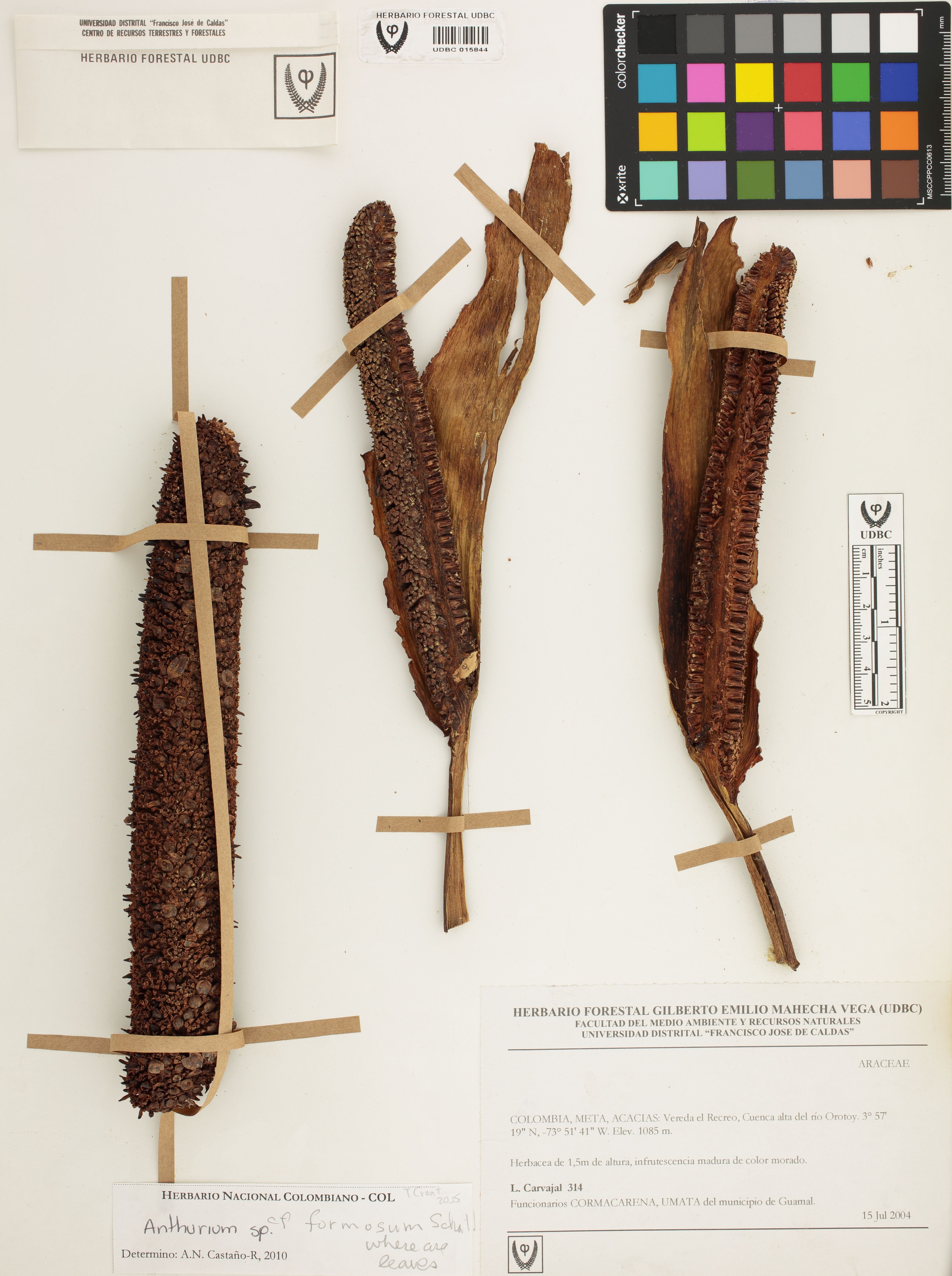 Fotografía del ejemplar Carvajal, L. 314, determinado como Anthurium formosum en el año 2015