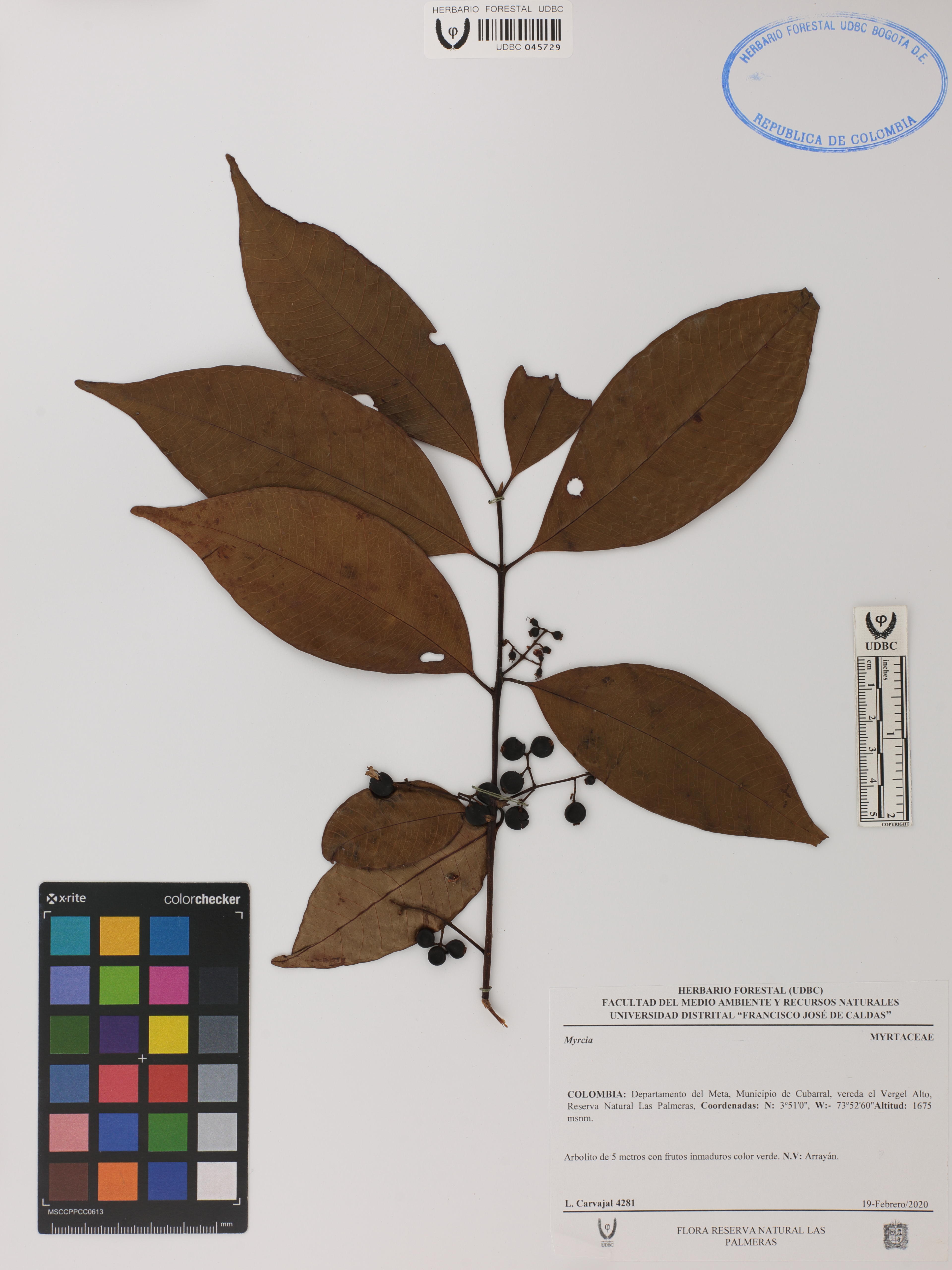 Fotografía del ejemplar Carvajal, L. 4281, determinado como Myrcia sp.