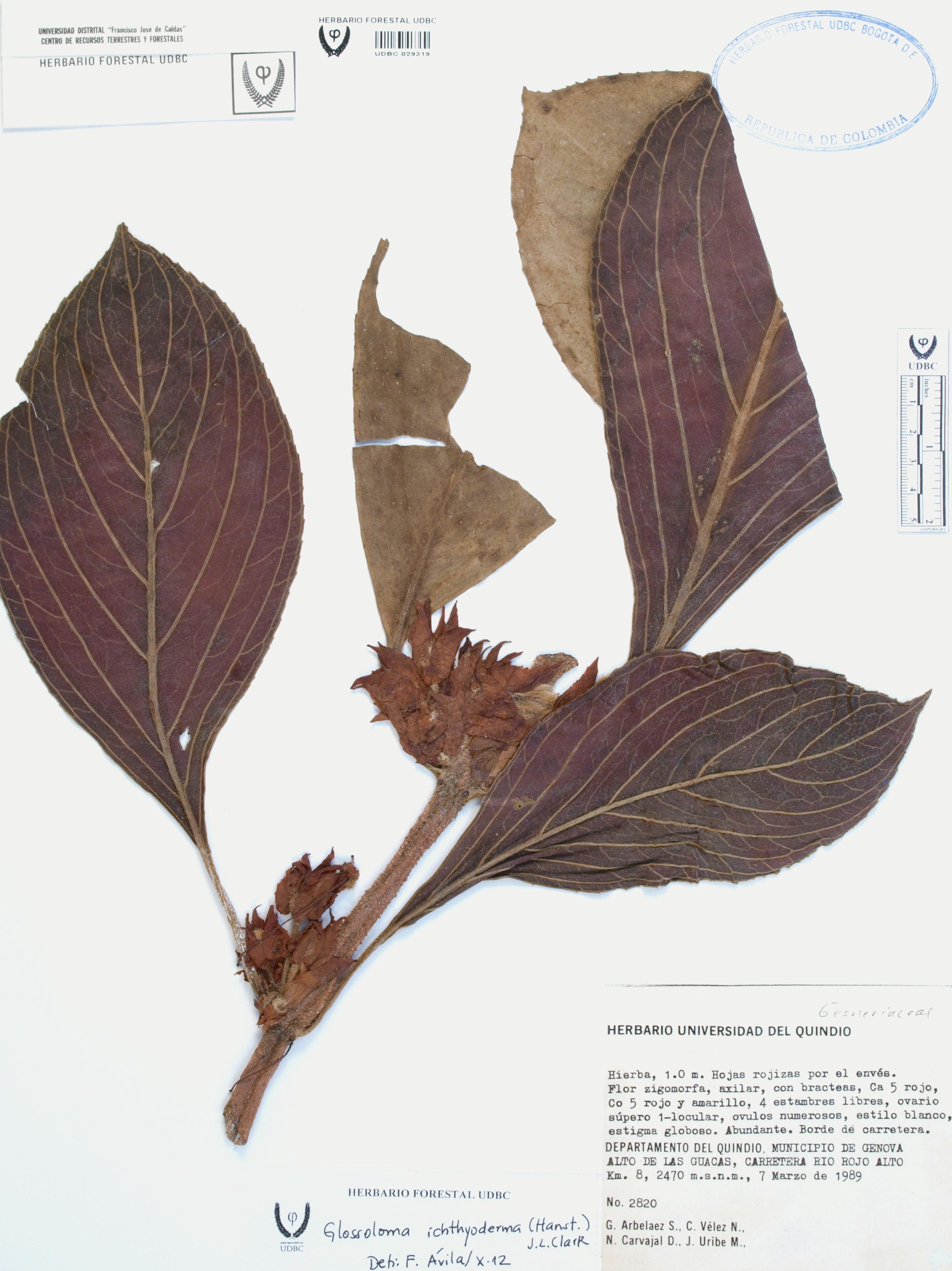 Fotografía del ejemplar Arbeláez, G. 2820, determinado como Glossoloma ichthyoderma en el año 2012