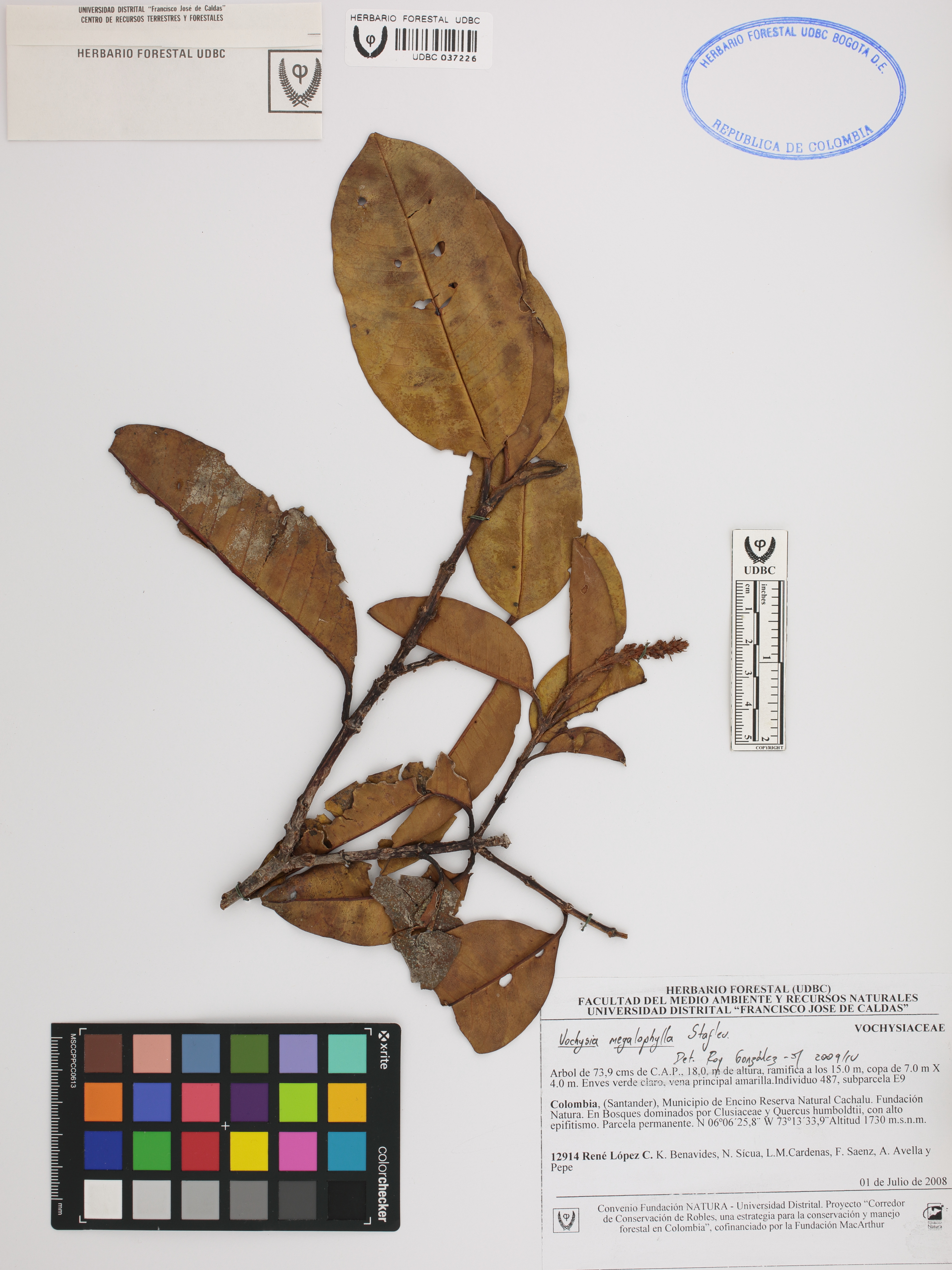 Fotografía del ejemplar López, R. 12914, determinado como Vochysia megalophylla en el año 2009