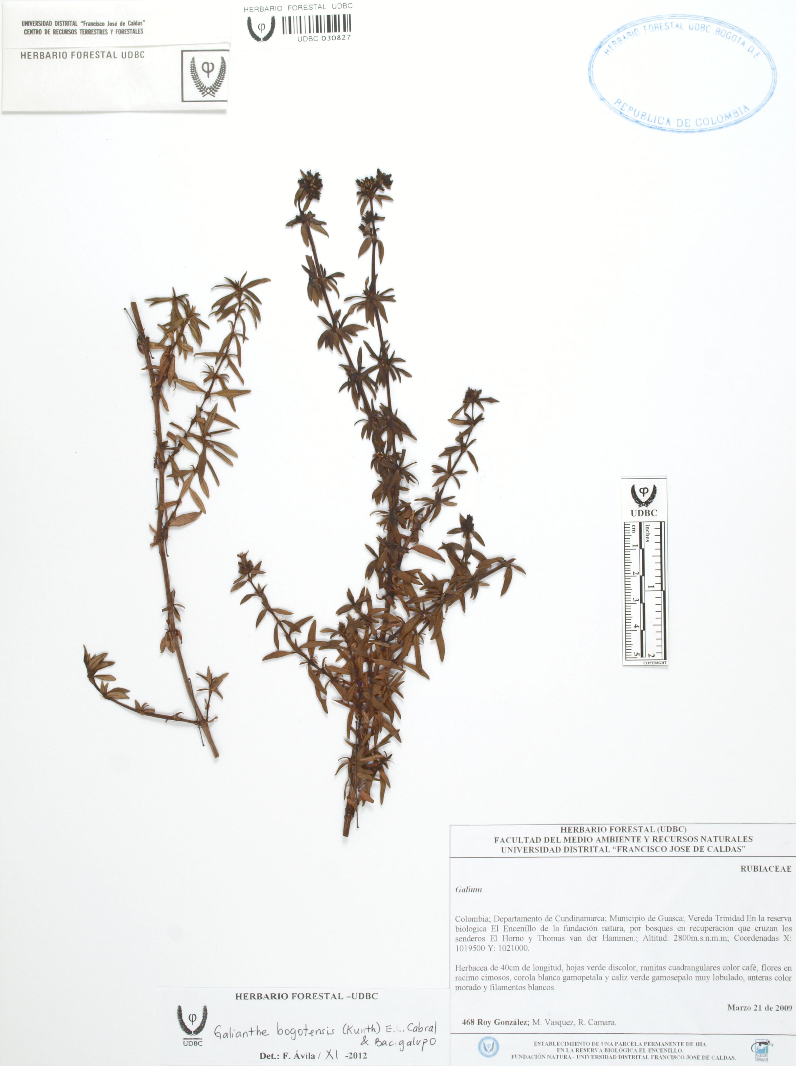 Fotografía del ejemplar González, R. 468, determinado como Galianthe bogotensis en el año 2012