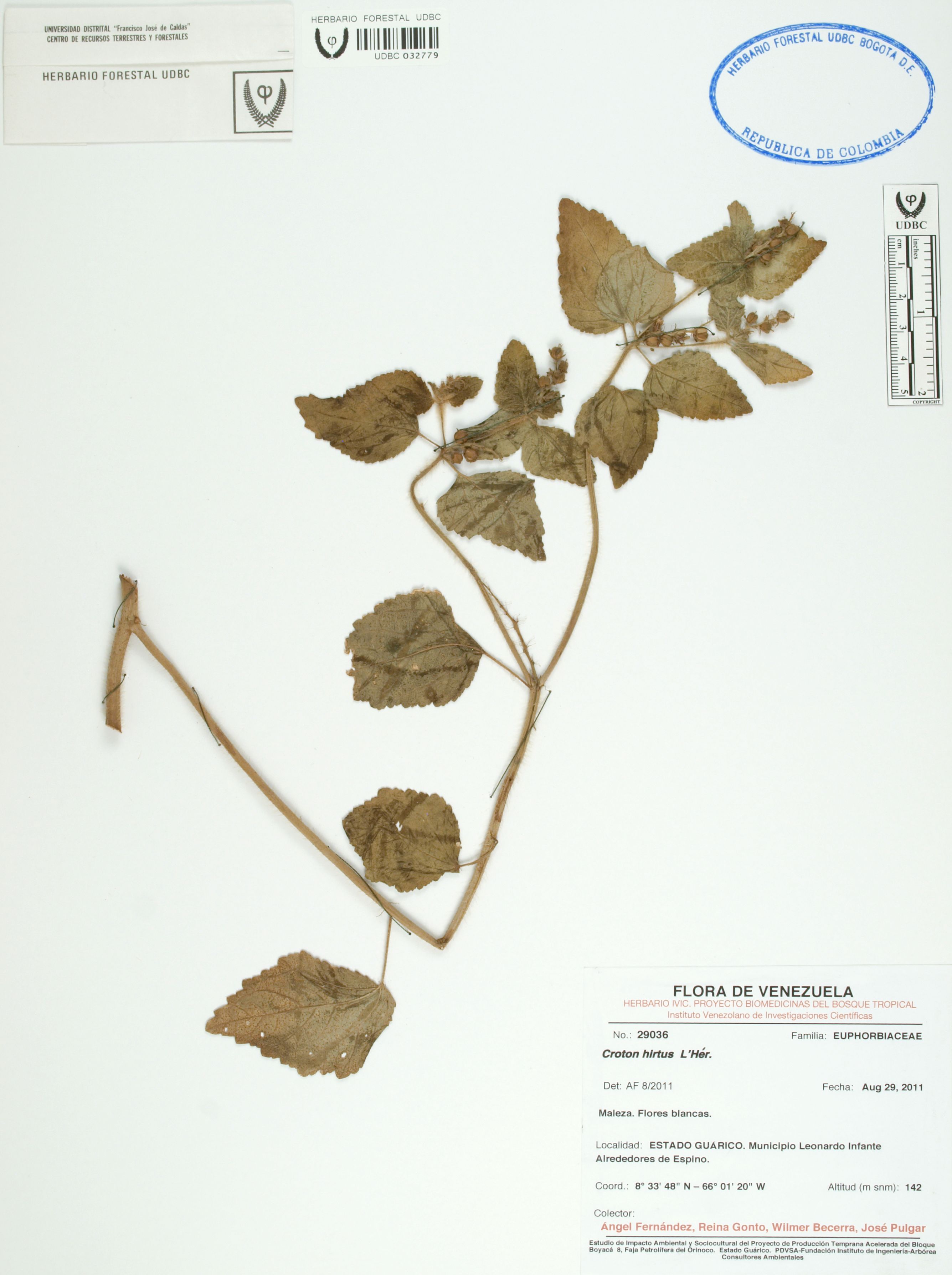 Fotografía del ejemplar Fernández, A. 29036, determinado como Croton hirtus en el año 2011