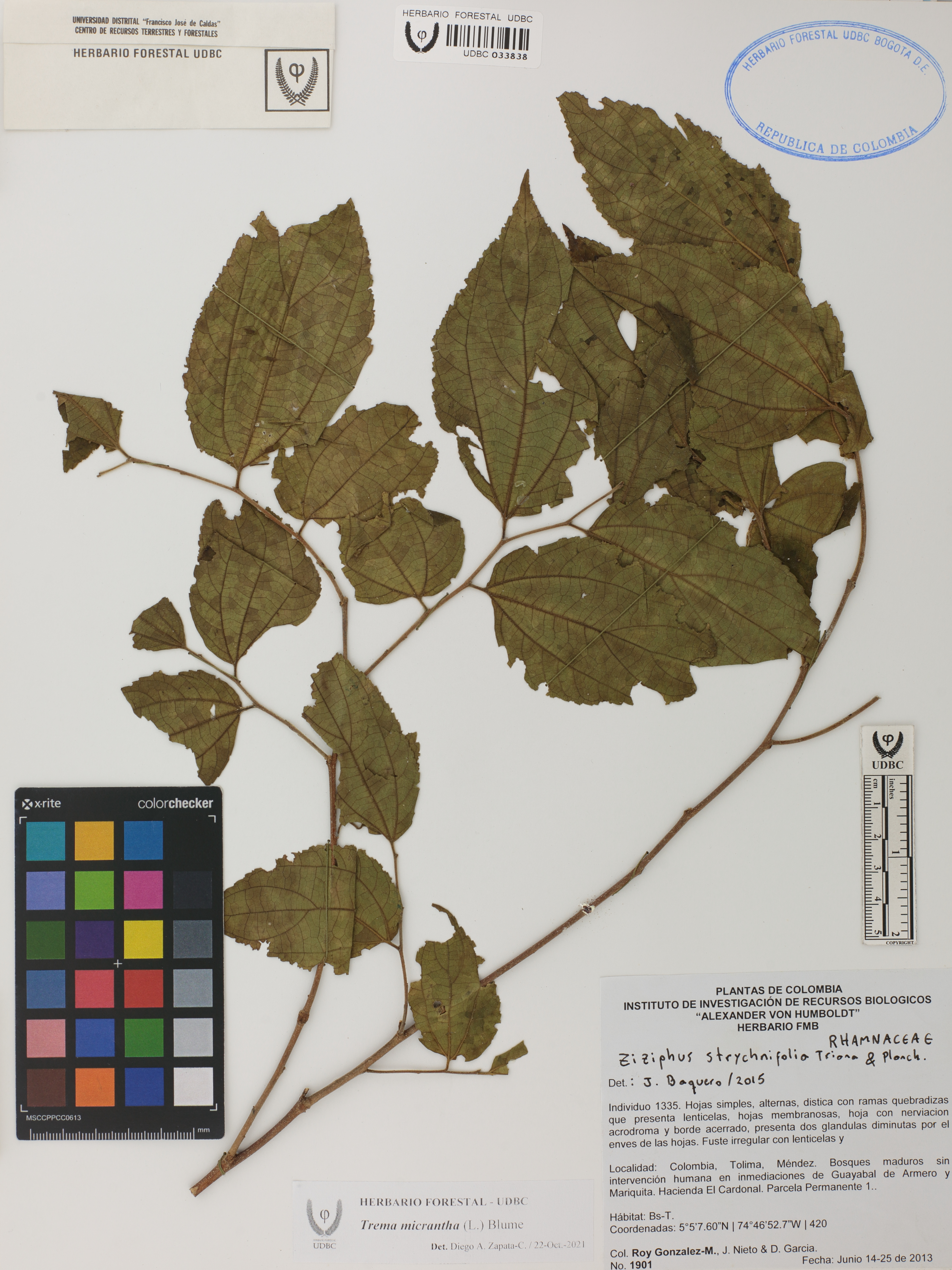 Fotografía del ejemplar González-M., R. 1901, determinado como Trema micranthum en el año 2021