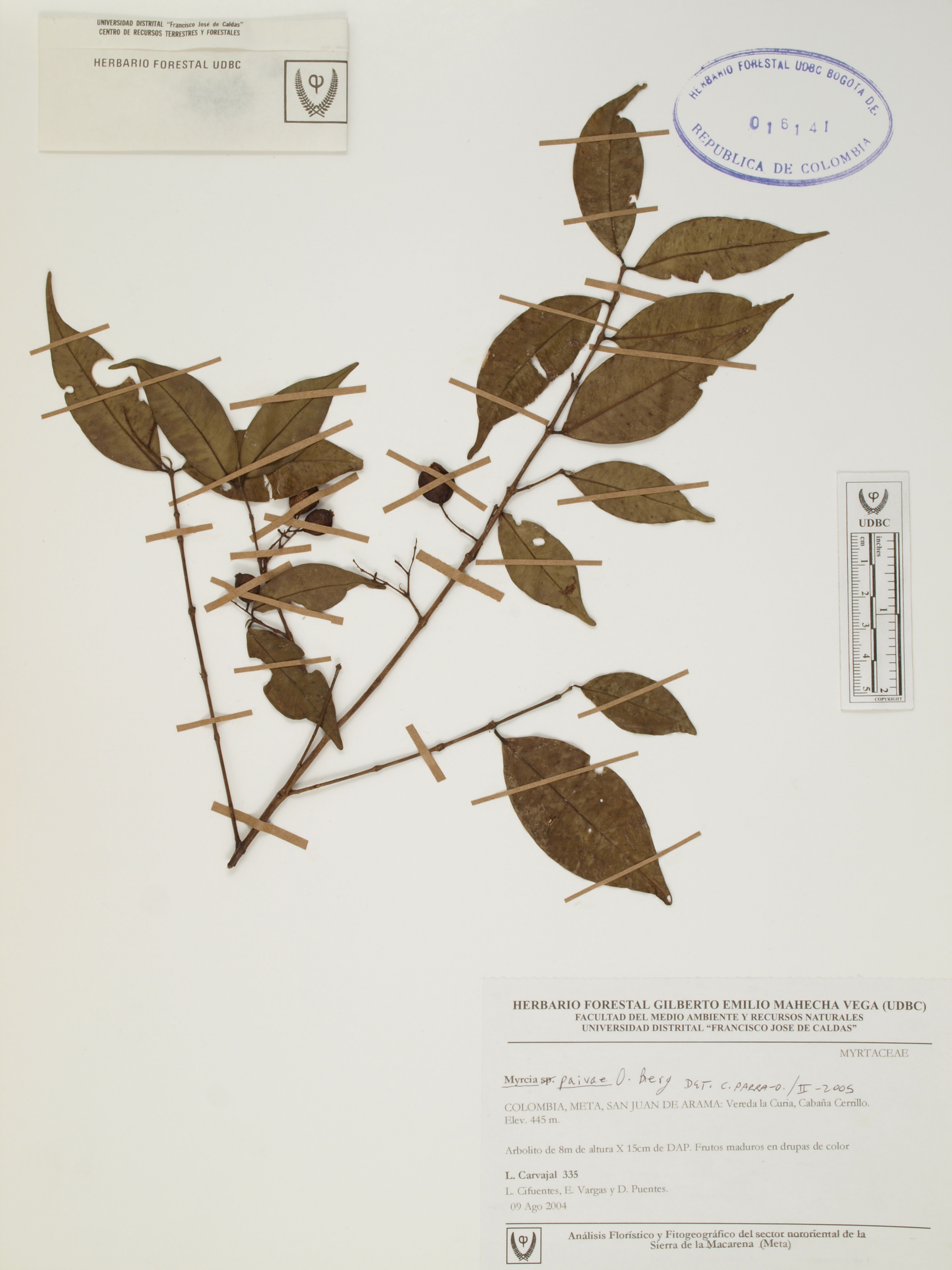 Fotografía del ejemplar Carvajal, L. 335, determinado como Myrcia paivae en el año 2005