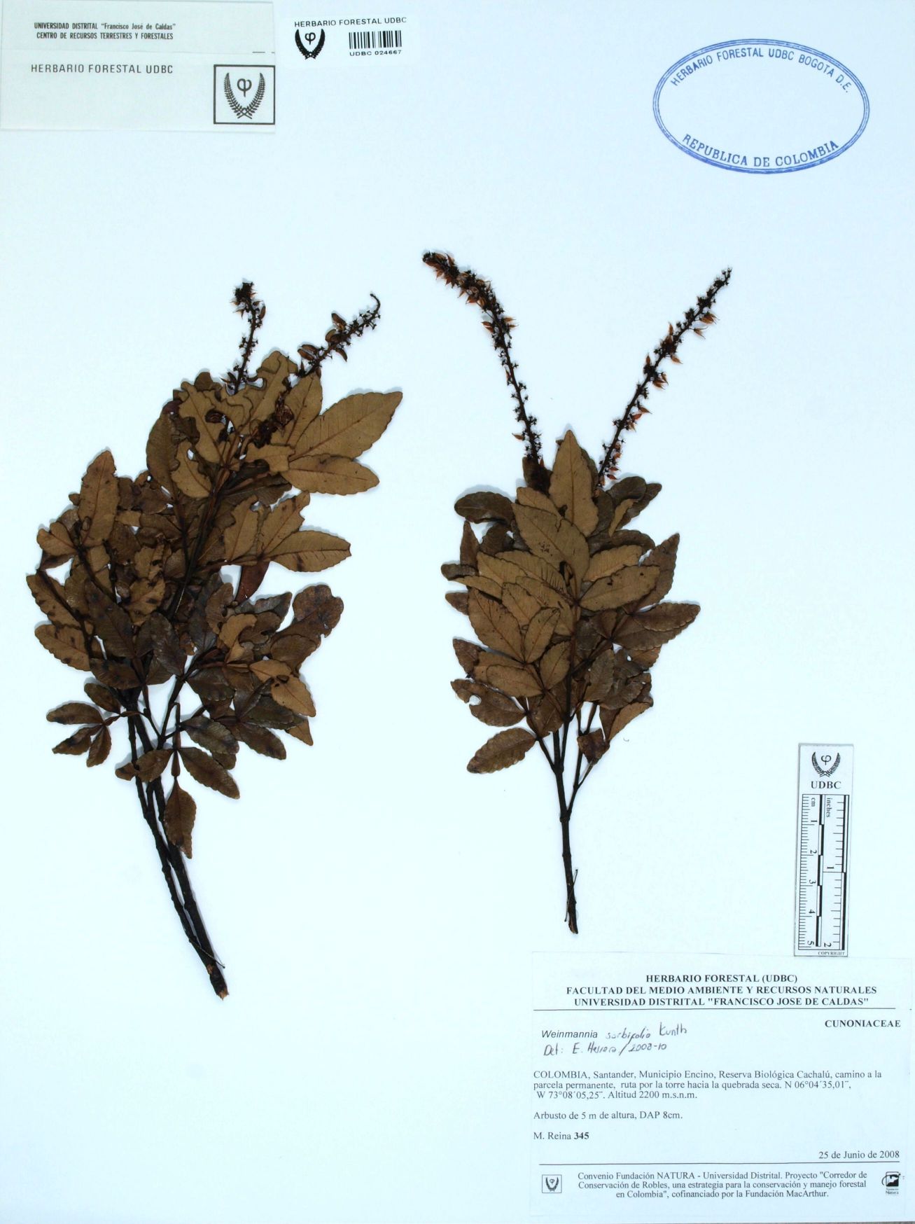 Fotografía del ejemplar Reina, M. 345, determinado como Weinmannia sorbifolia en el año 2008