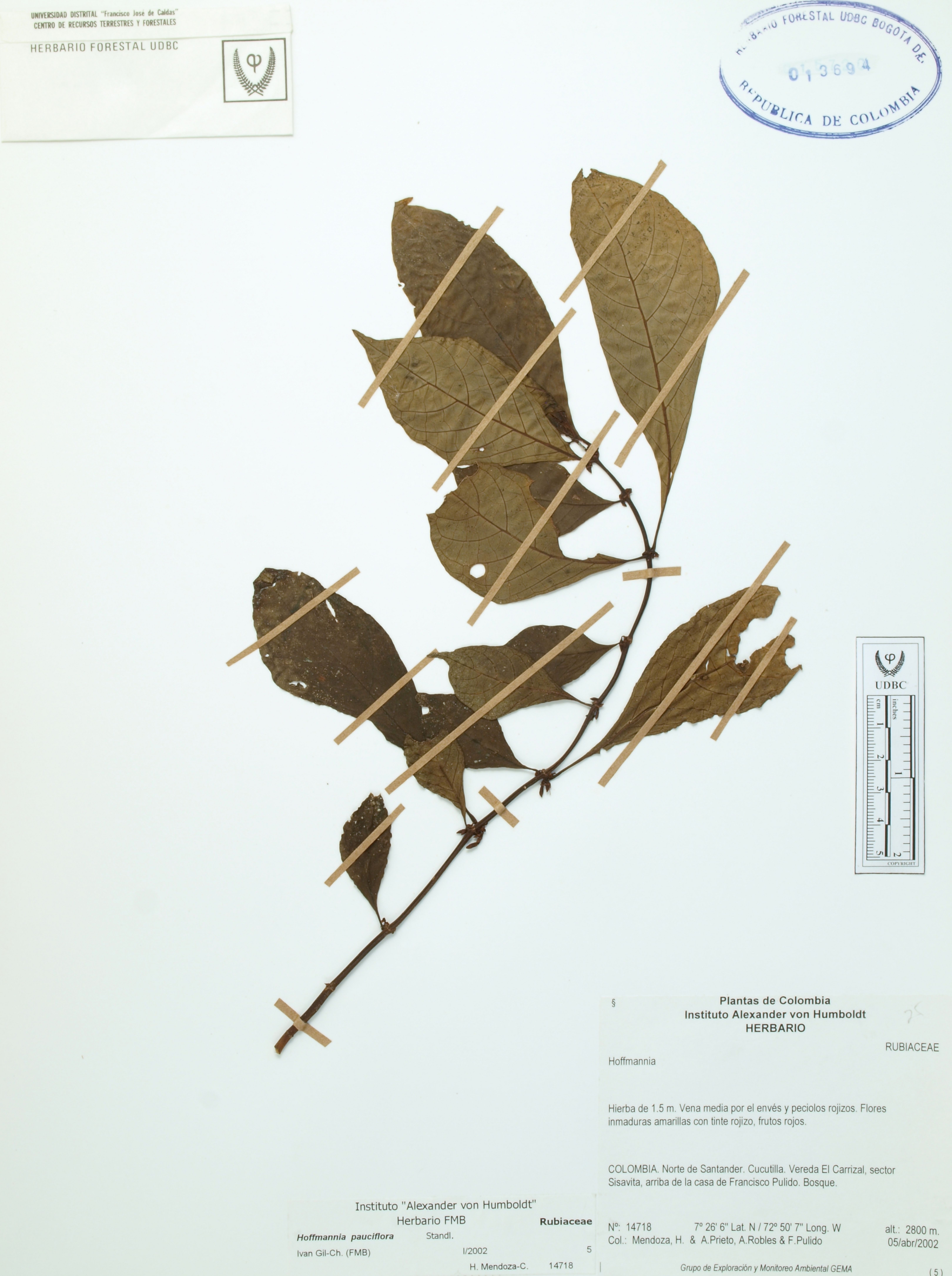 Fotografía del ejemplar Mendoza, H. 14718, determinado como Hoffmannia pauciflora en el año 2002