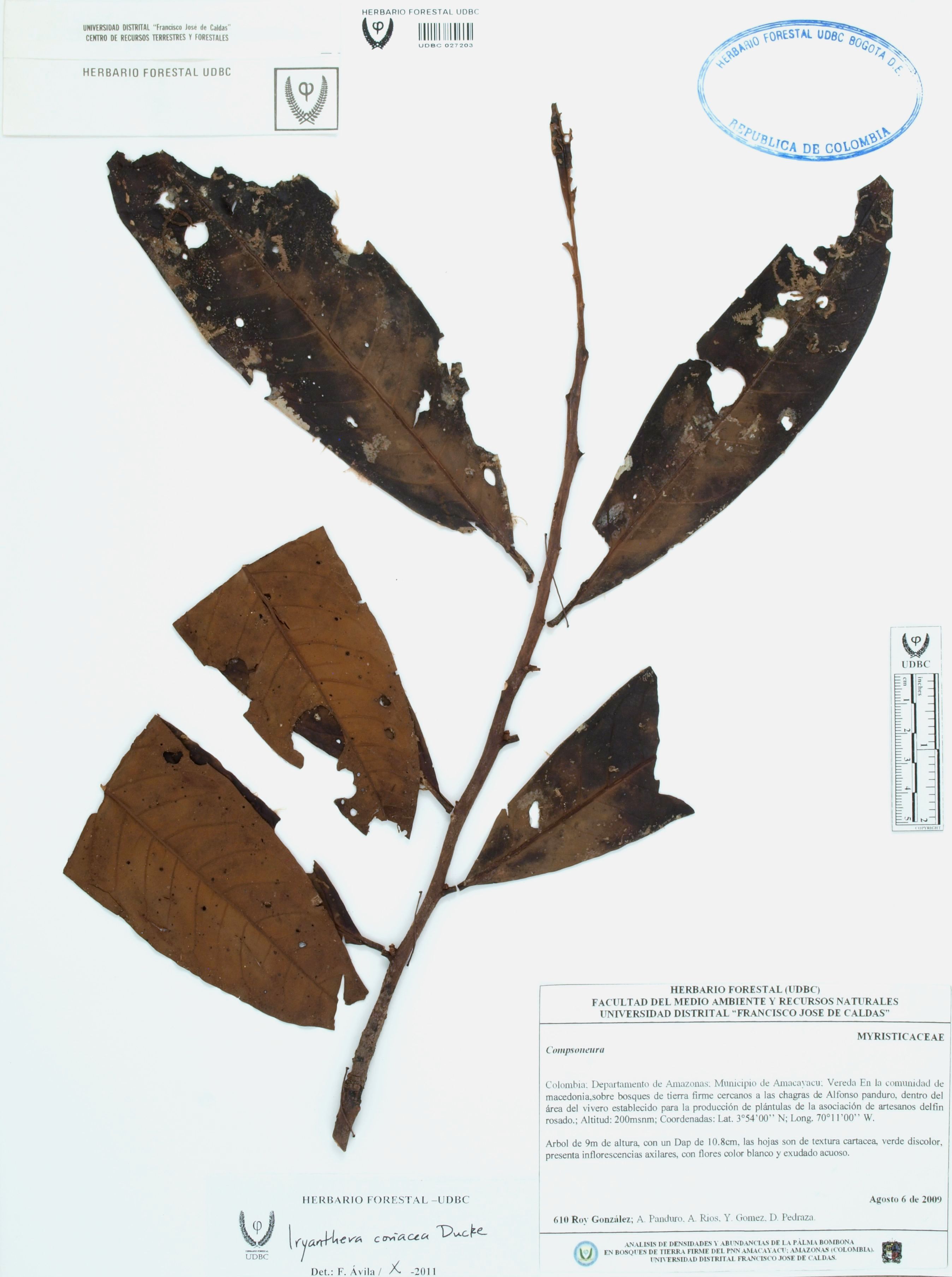 Fotografía del ejemplar González, R. 610, determinado como Iryanthera coriacea en el año 2011