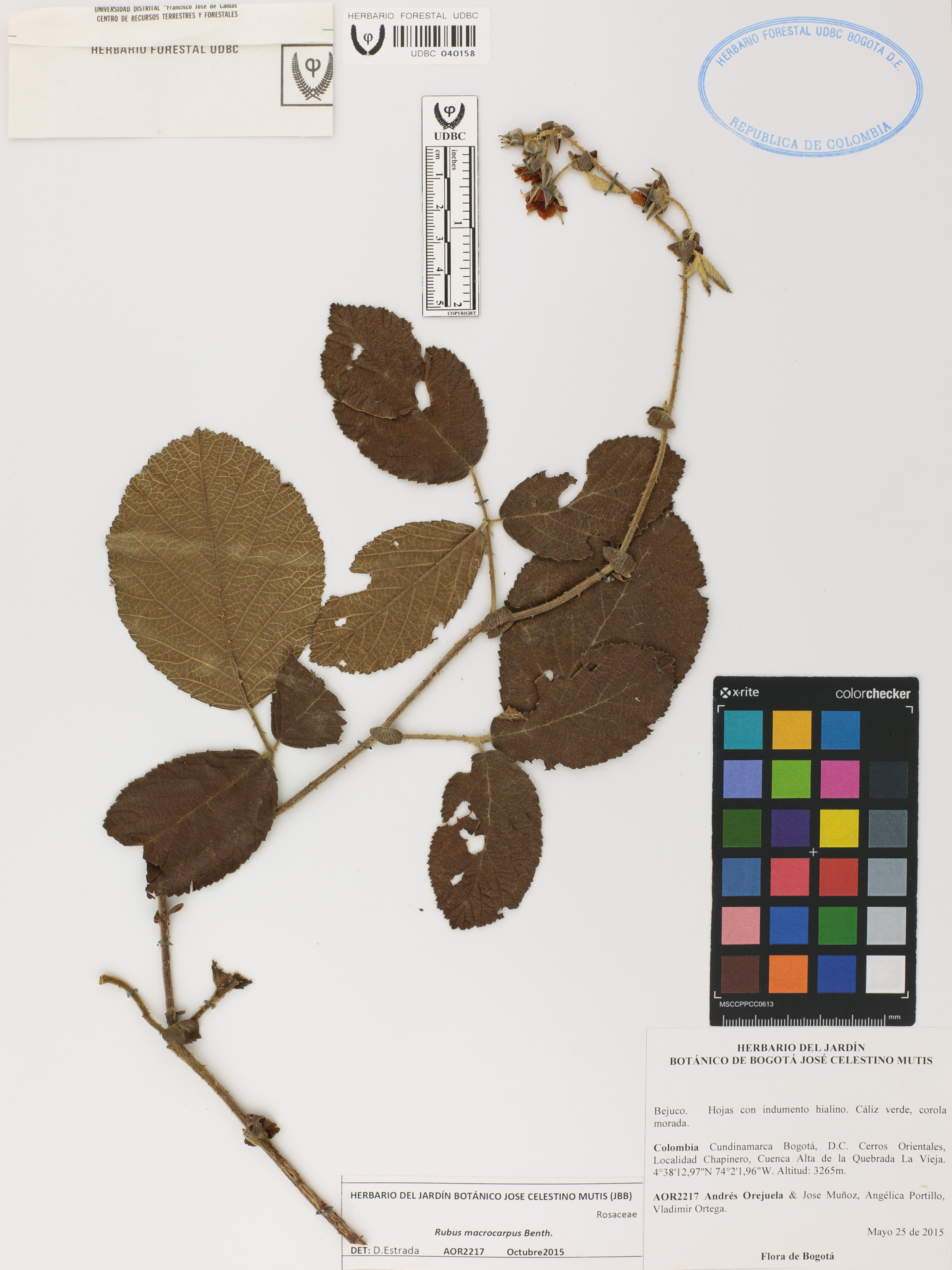 Fotografía del ejemplar Orejuela, A. 2217, determinado como Rubus macrocarpus en el año 2015