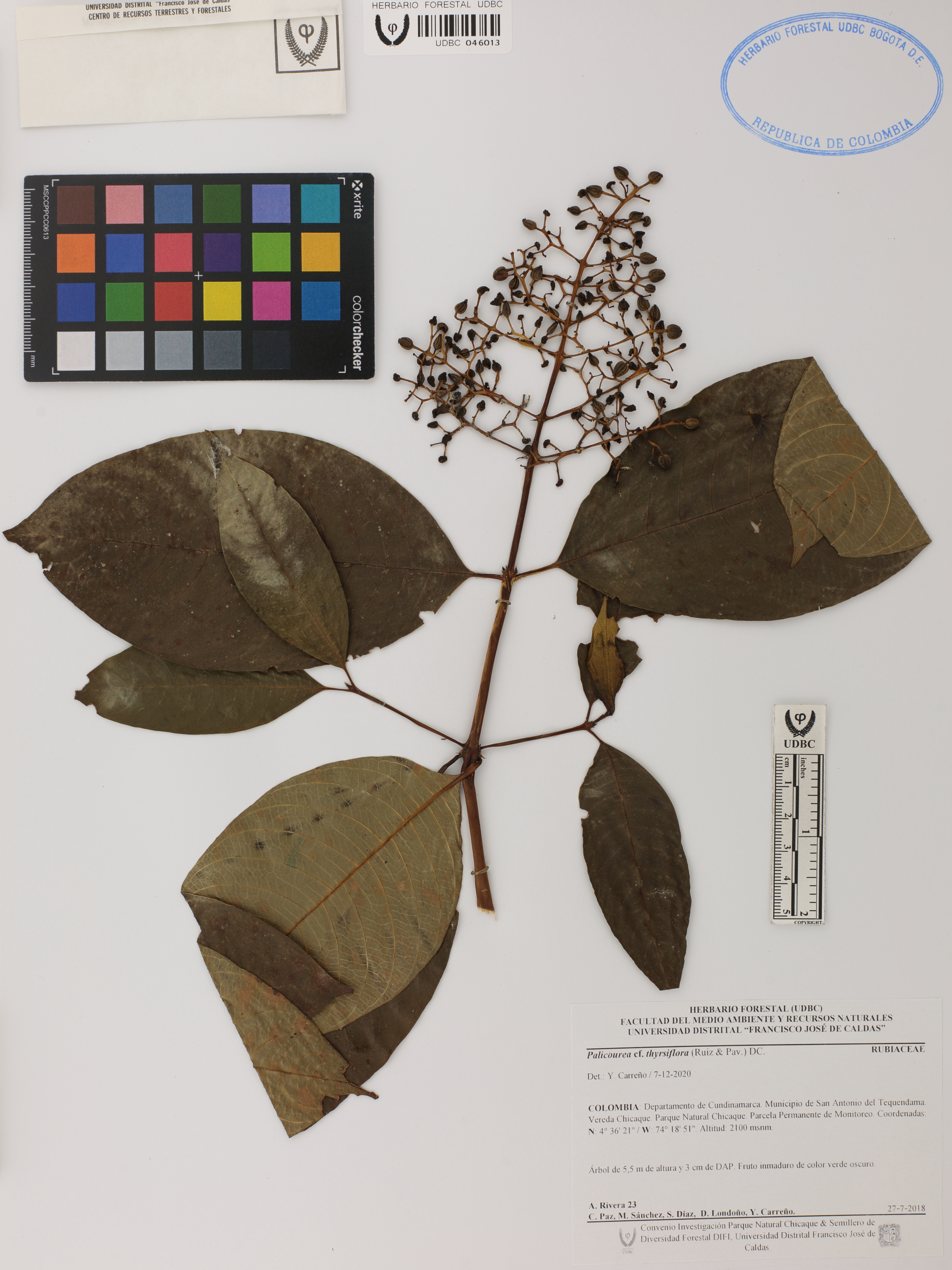 Fotografía del ejemplar Rivera, A. 23, determinado como Palicourea thyrsiflora en el año 2020