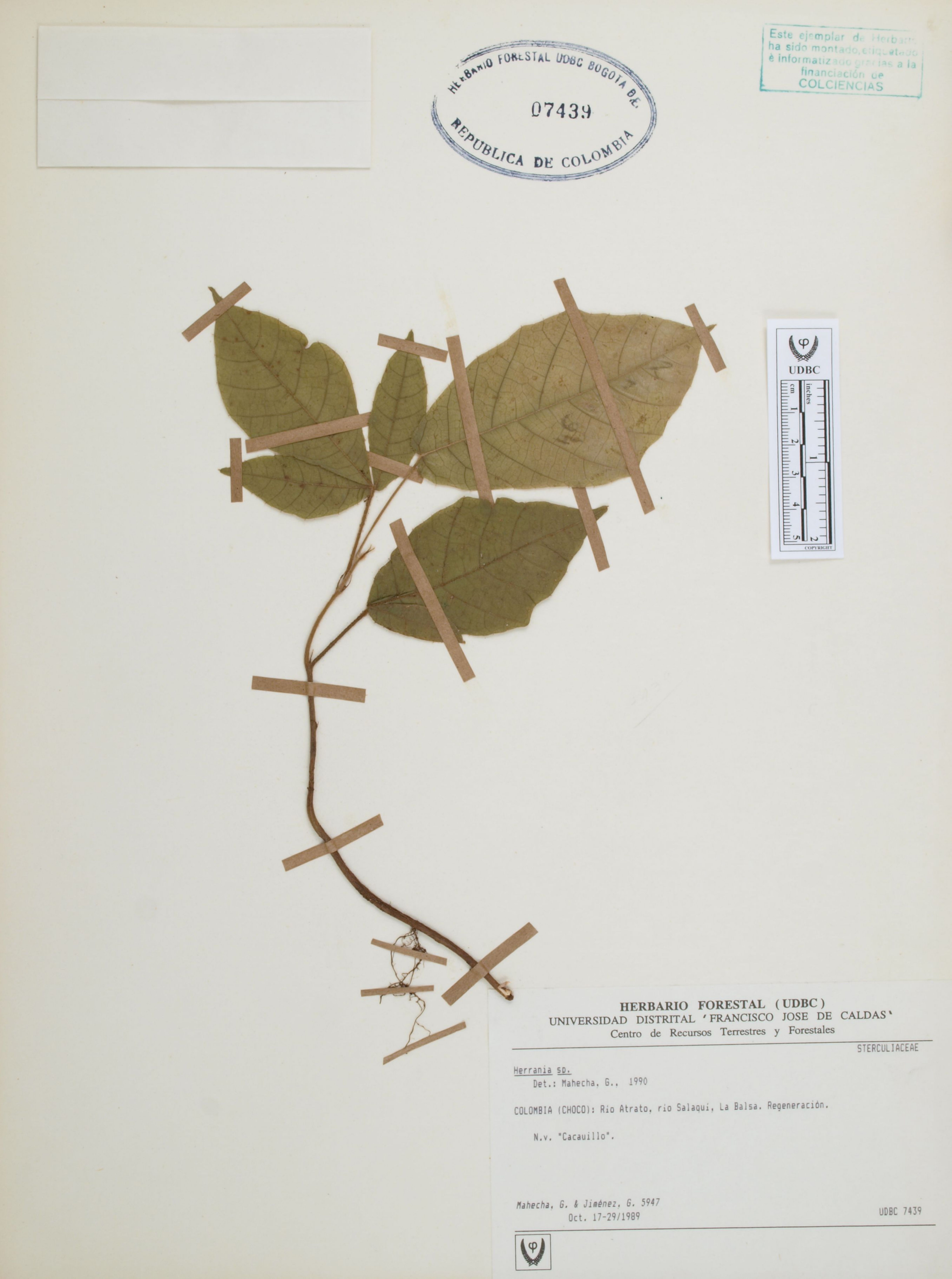Fotografía del ejemplar Mahecha, G. 5947, determinado como Herrania sp. en el año 1990