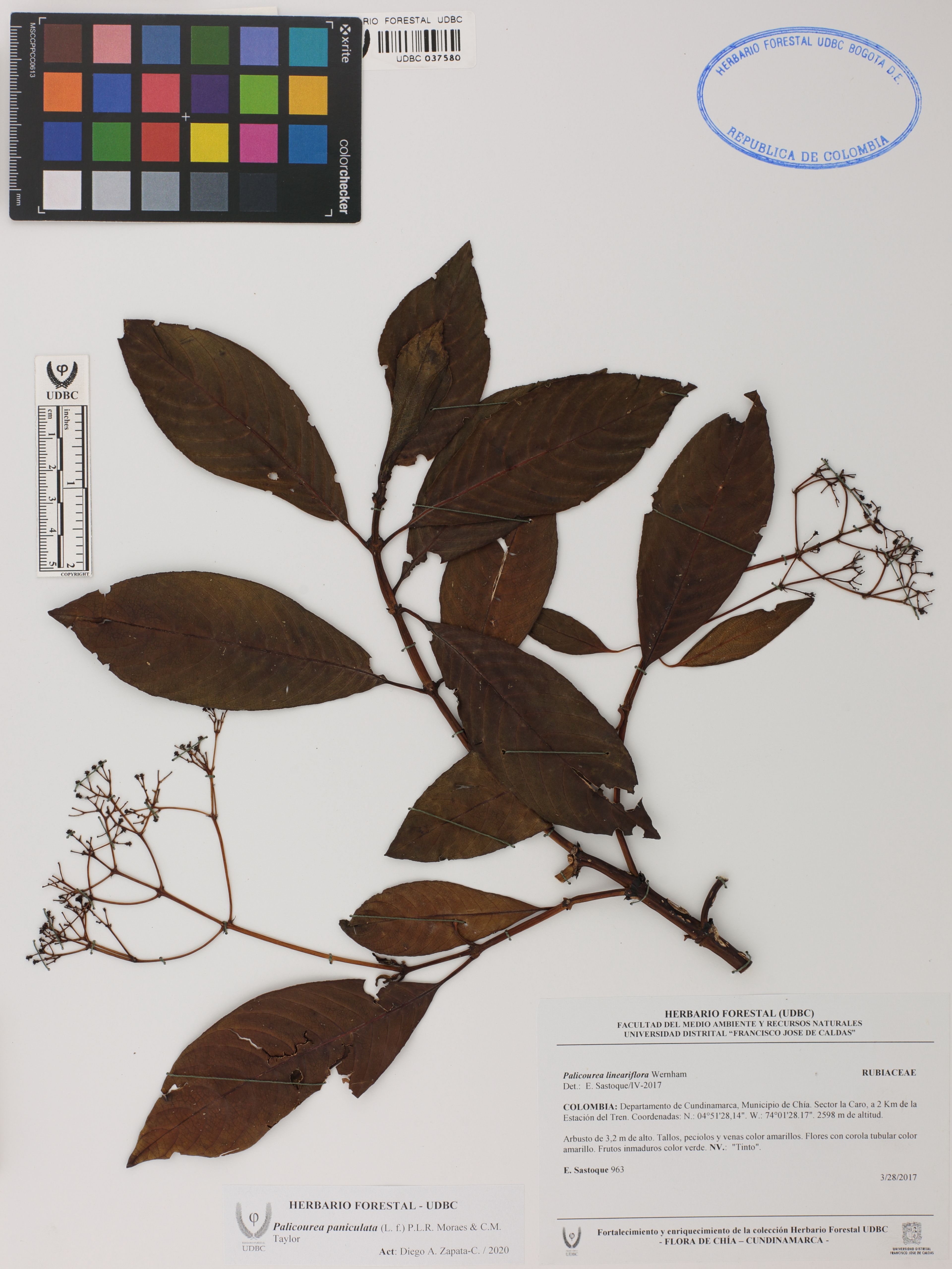 Fotografía del ejemplar Sastoque, E. 963, determinado como Palicourea paniculata en el año 2017