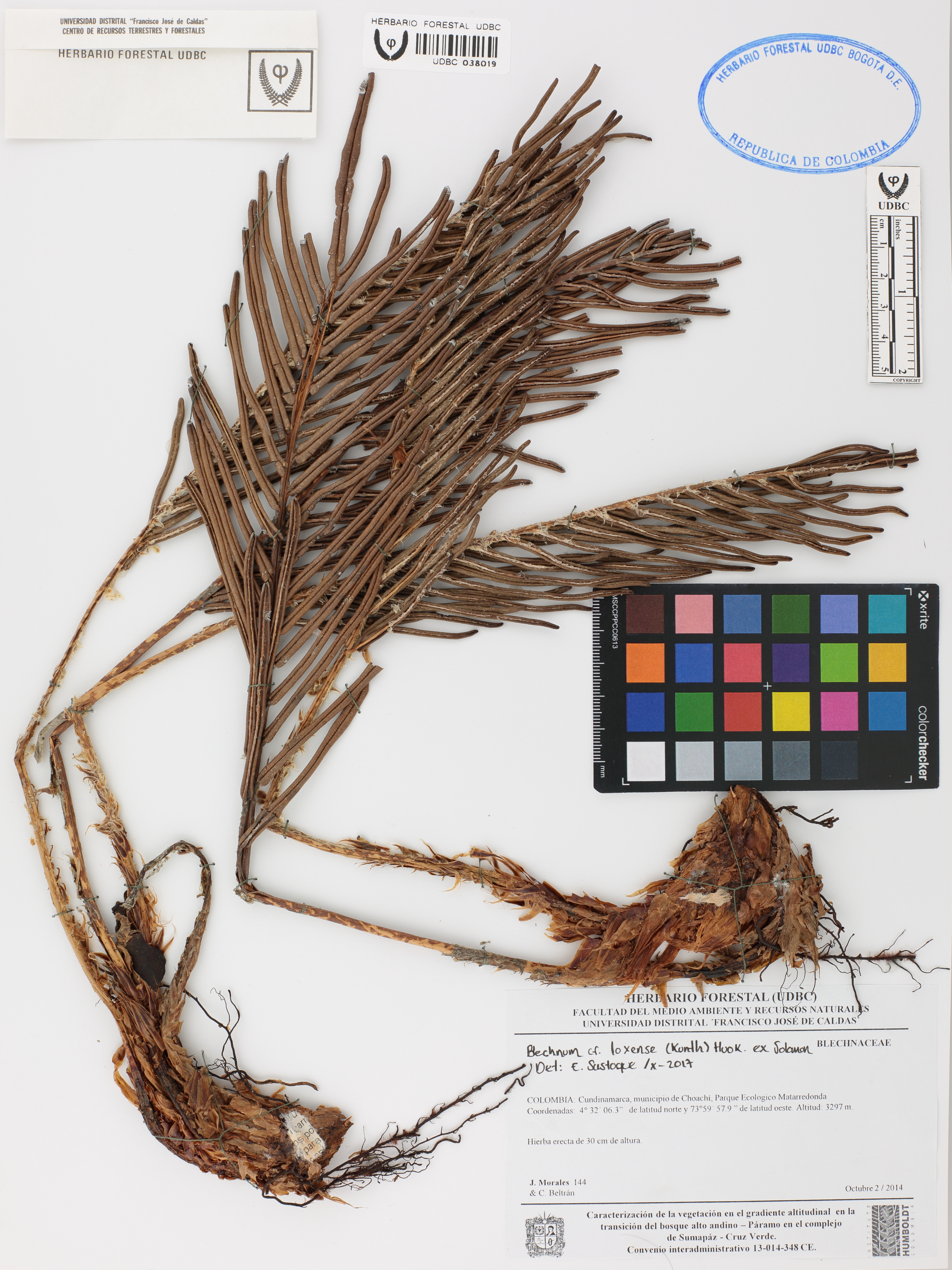 Fotografía del ejemplar Morales, J. 144, determinado como Blechnum loxense en el año 2017