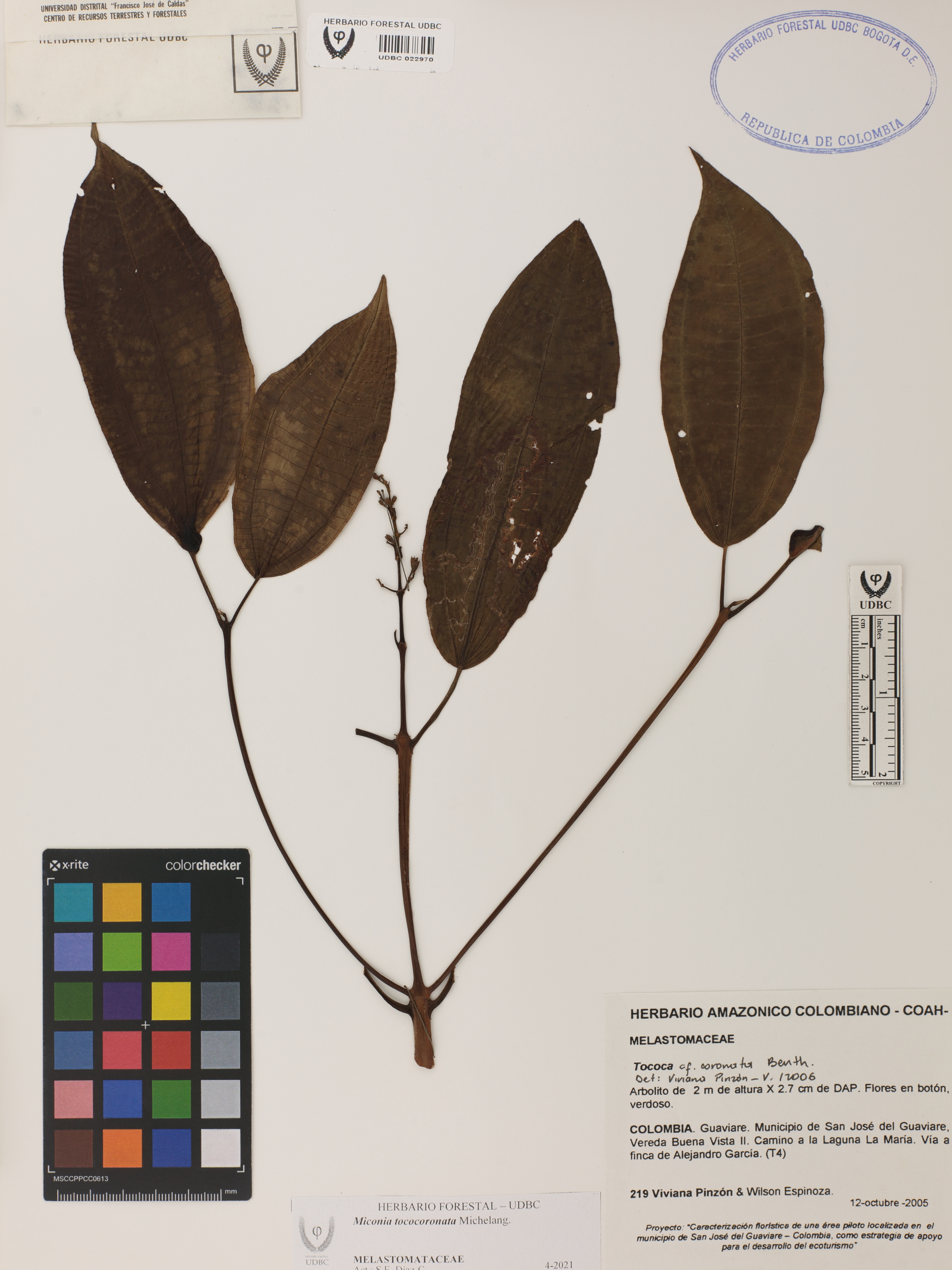 | dc.description | Fotografía del ejemplar Pinzón, V. 219, determinado como Miconia tococoronata en el año 2006 | |