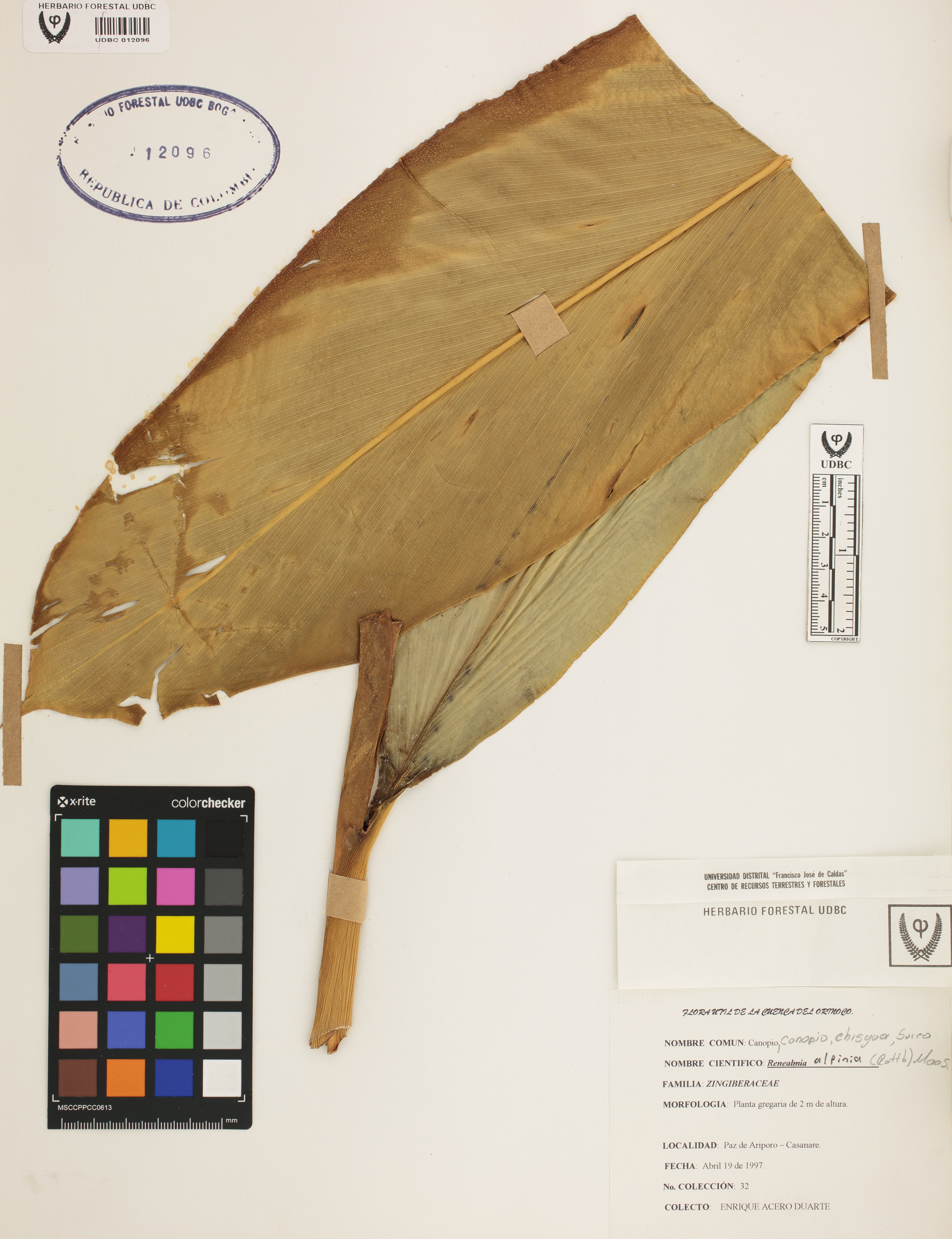 Fotografía del ejemplar Acero, E. 32, determinado como Renealmia alpinia