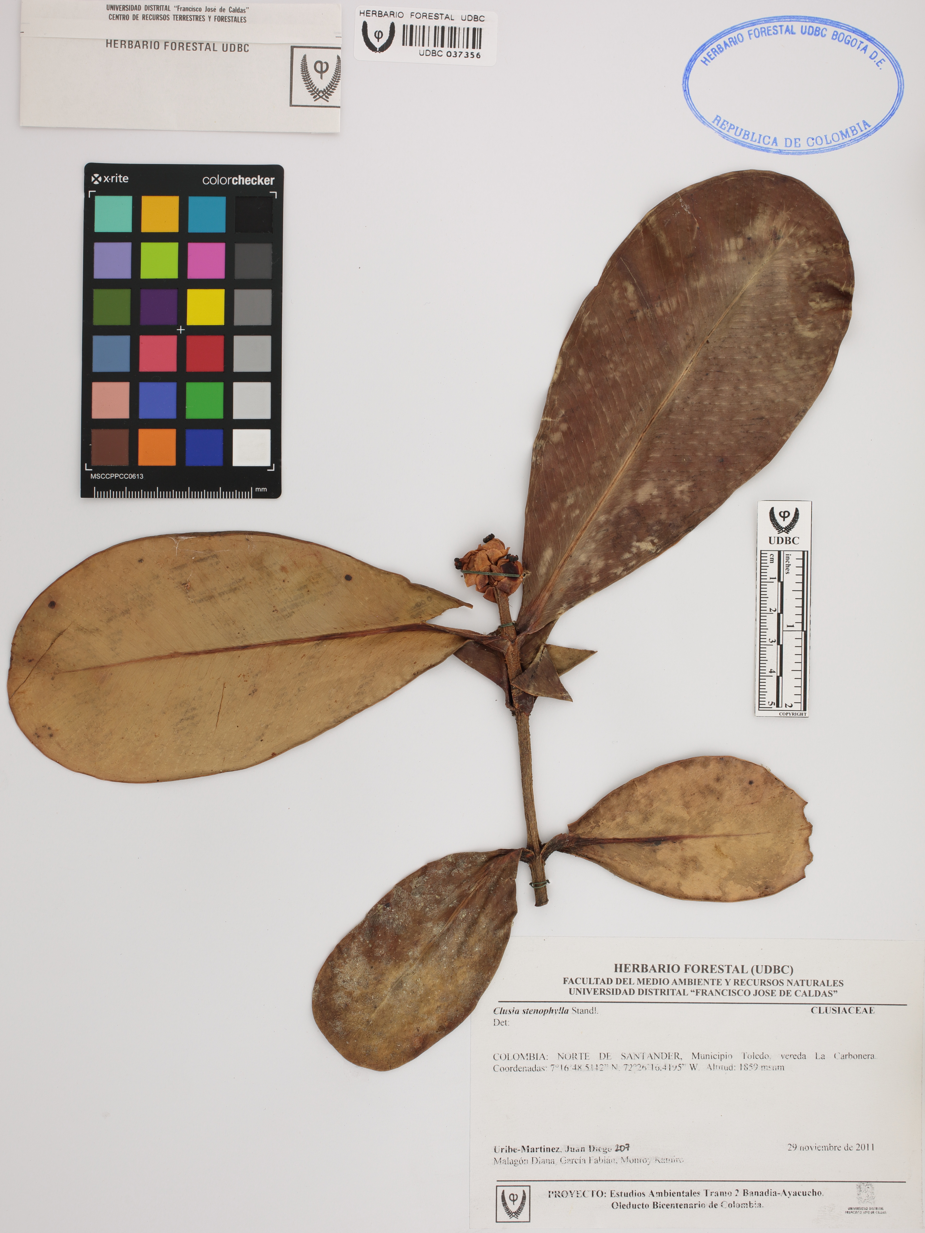 Fotografía del ejemplar Uribe-M., J. 207, determinado como Clusia stenophylla