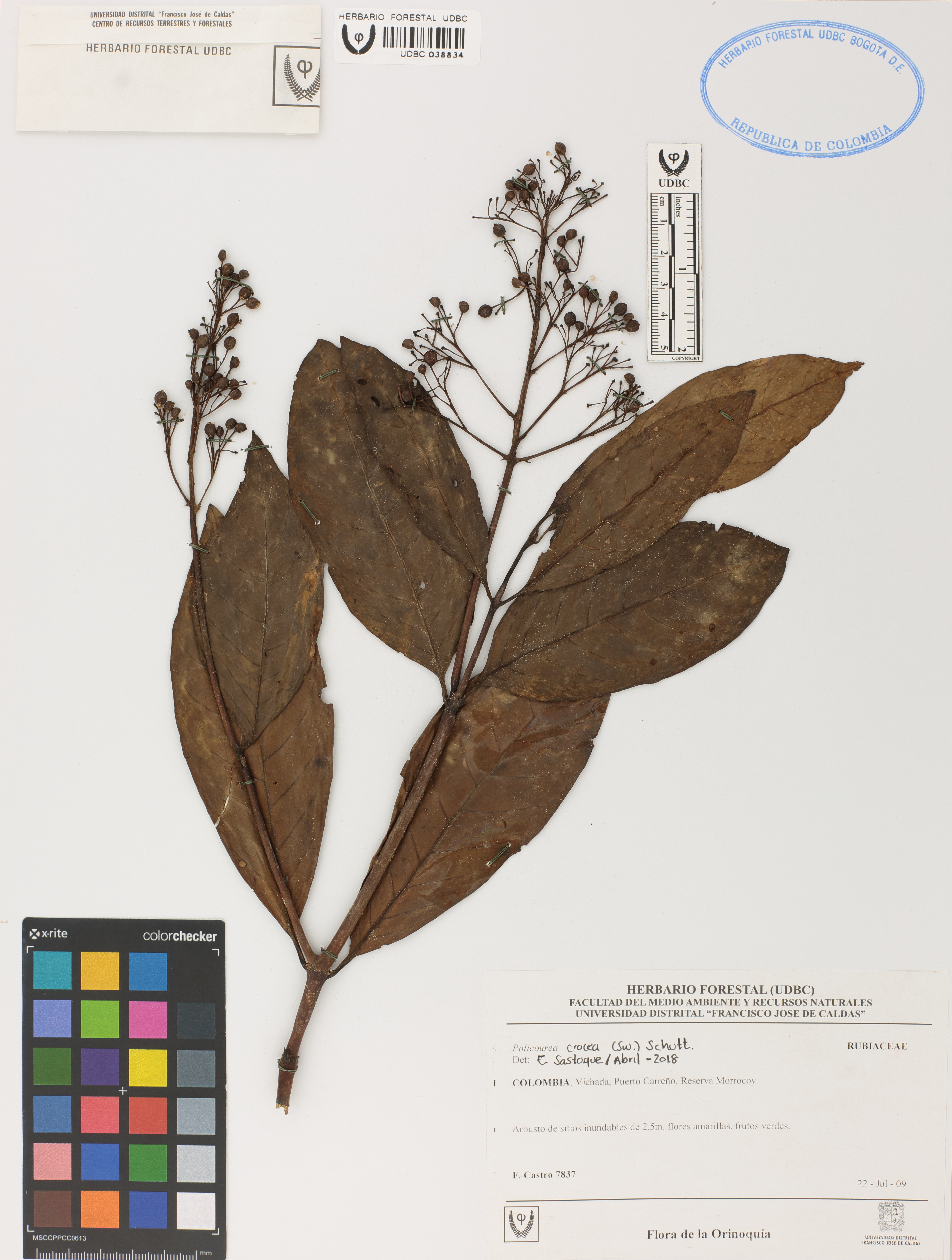 Fotografía del ejemplar Castro, F. 7837, determinado como Palicourea crocea en el año 2018