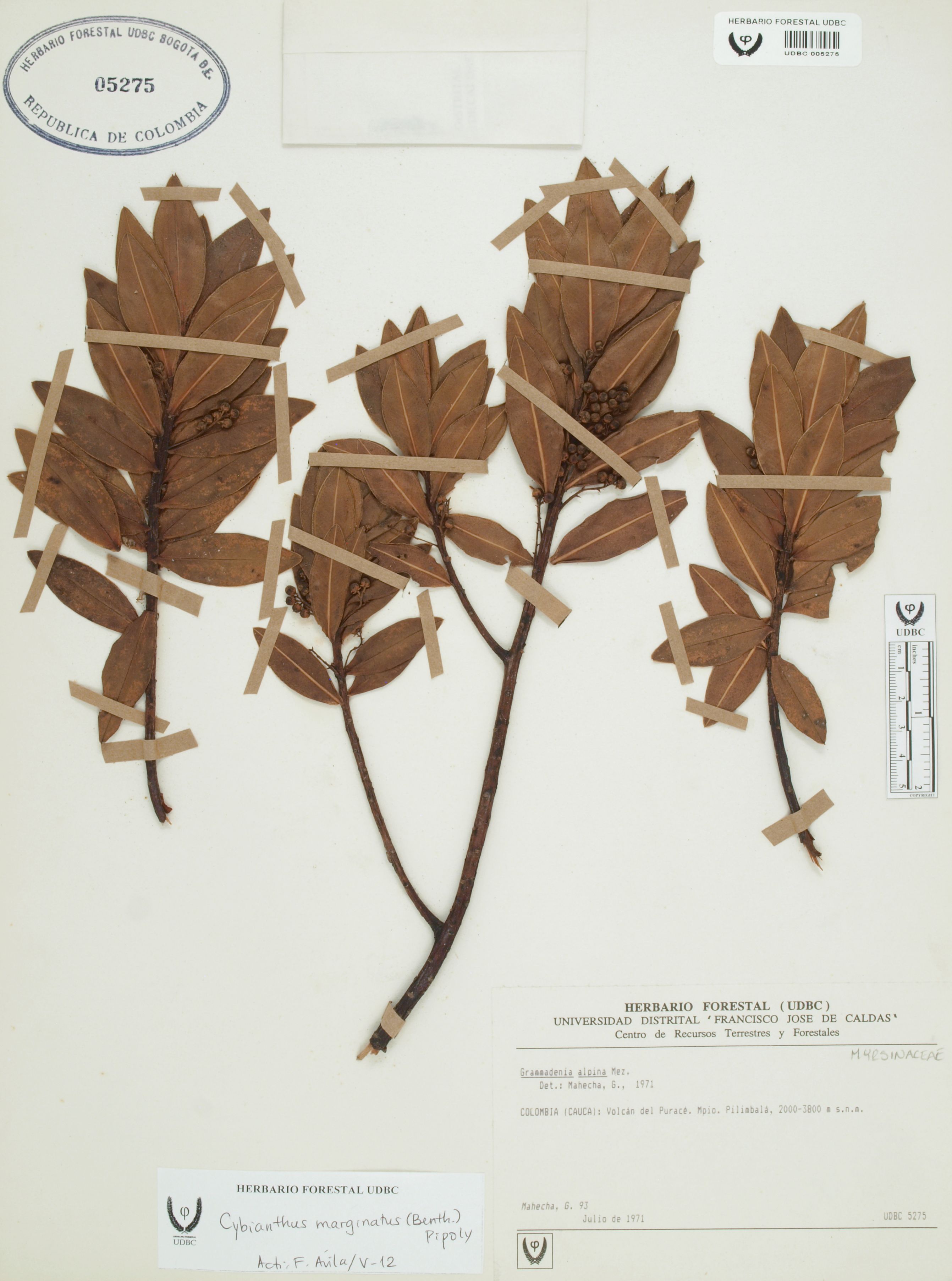 Fotografía del ejemplar Mahecha, G. 93, determinado como Cybianthus marginatus en el año 2012