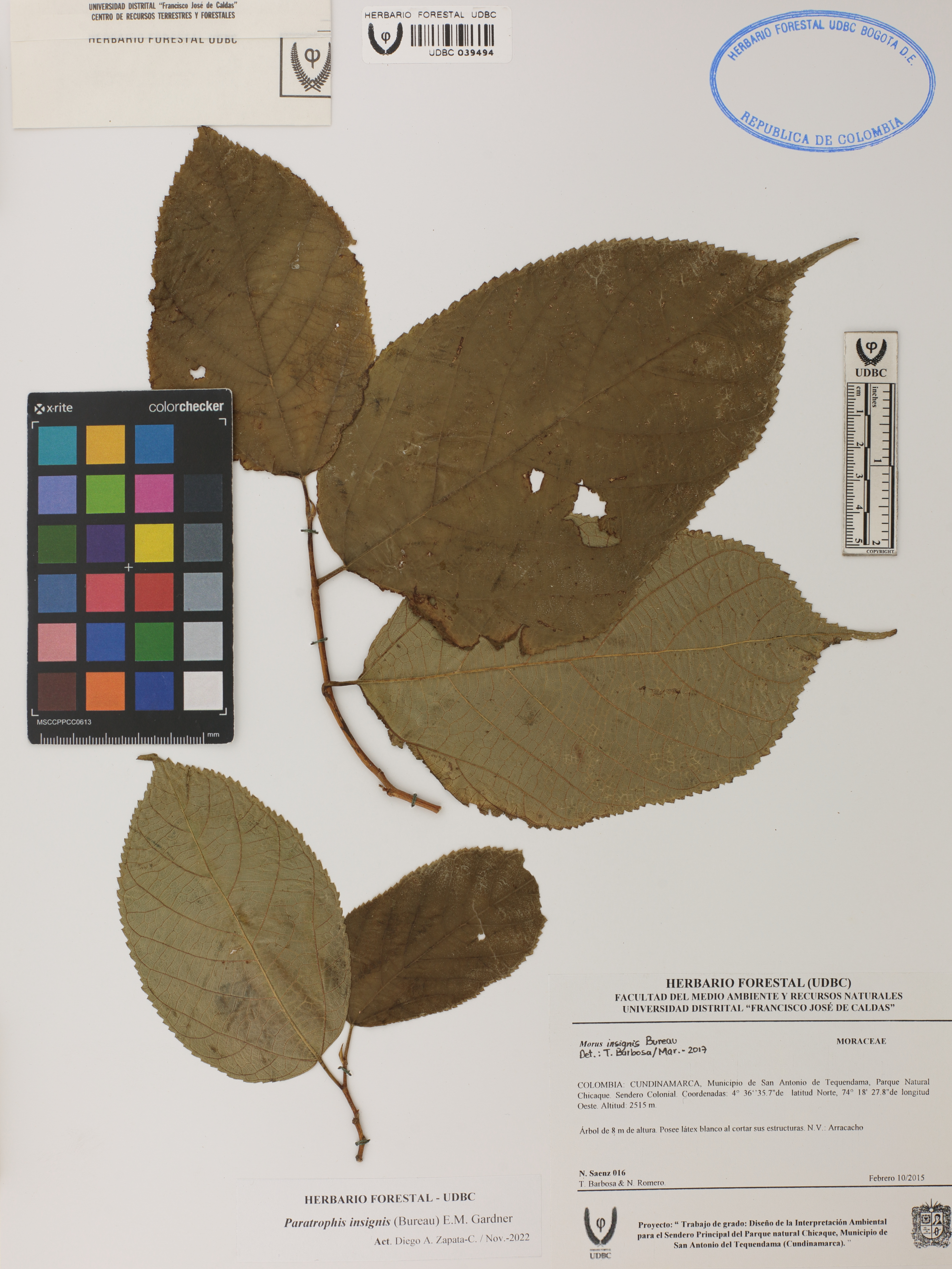 Fotografía del ejemplar Sáenz, N. 16, determinado como Paratrophis insignis en el año 2017