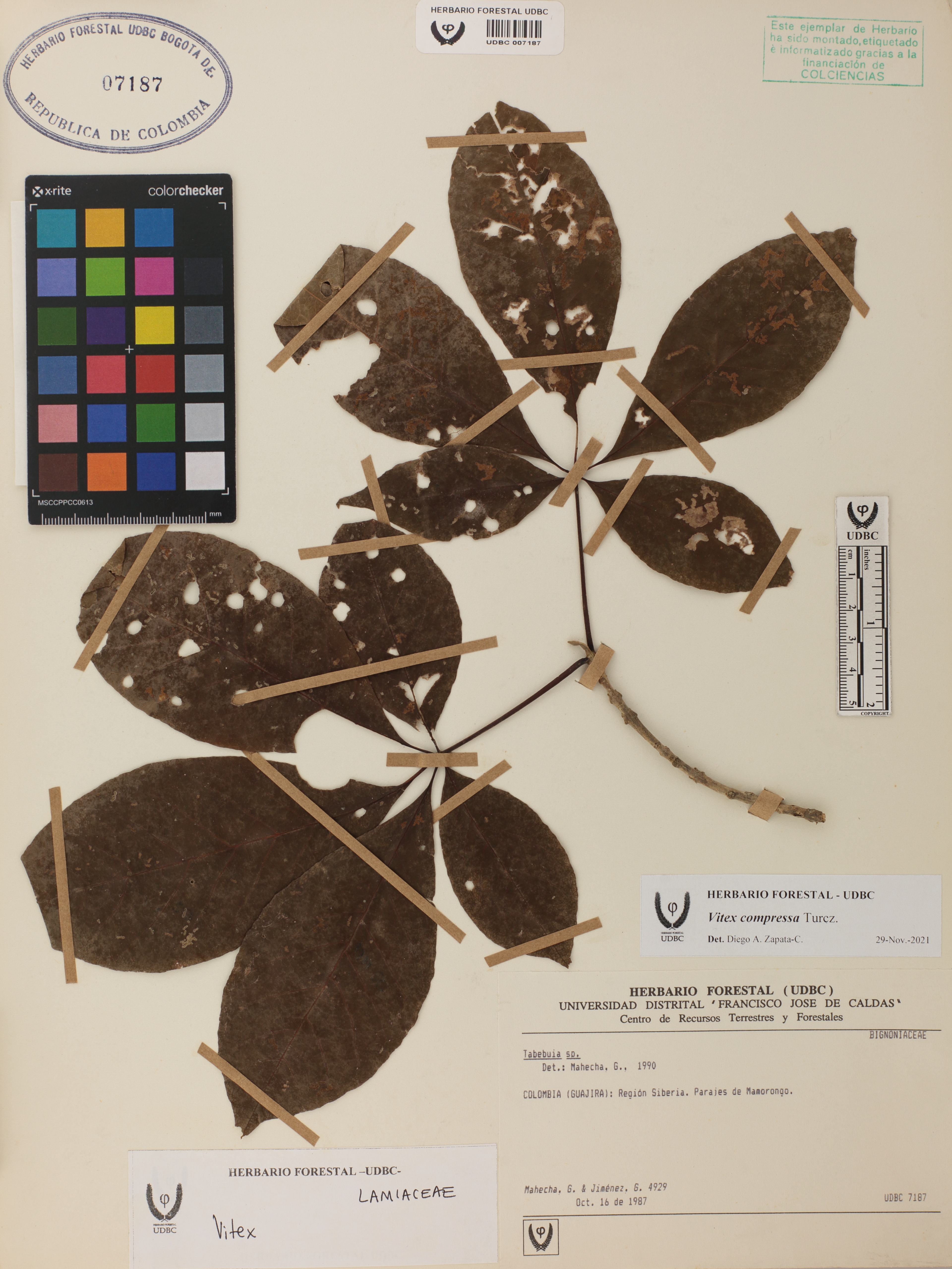 Fotografía del ejemplar Mahecha, G. 4929, determinado como Vitex compressa en el año 2021