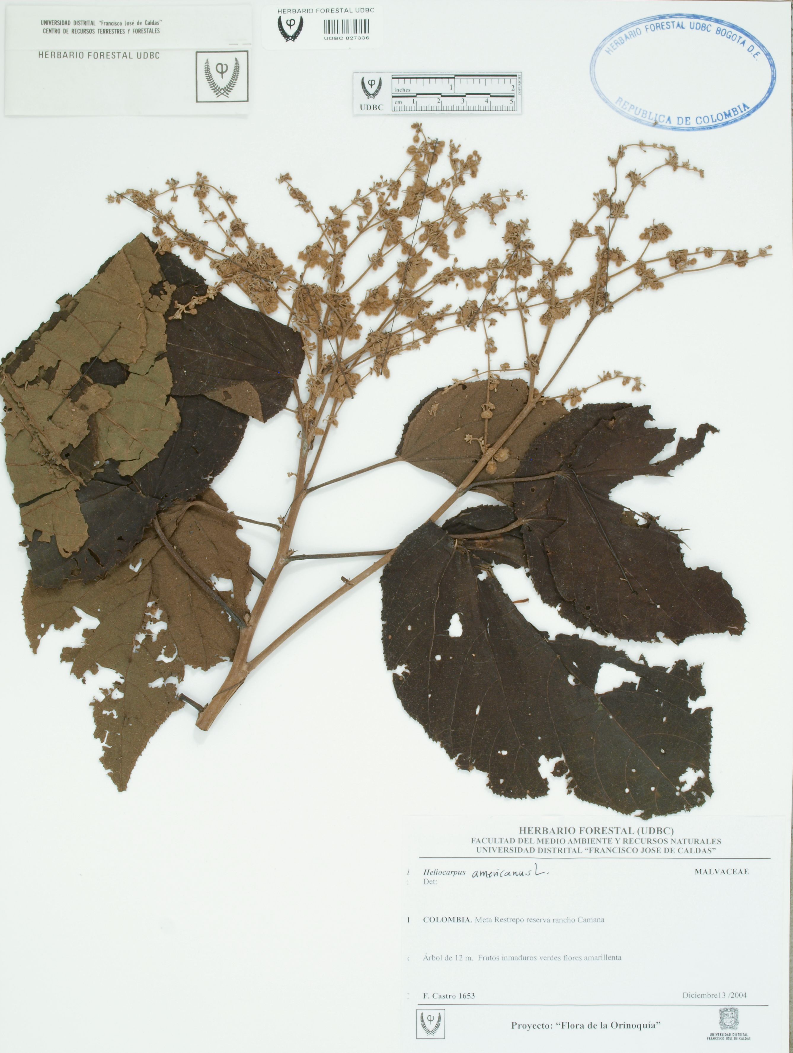 Fotografía del ejemplar Castro, F. 1653, determinado como Heliocarpus americanus