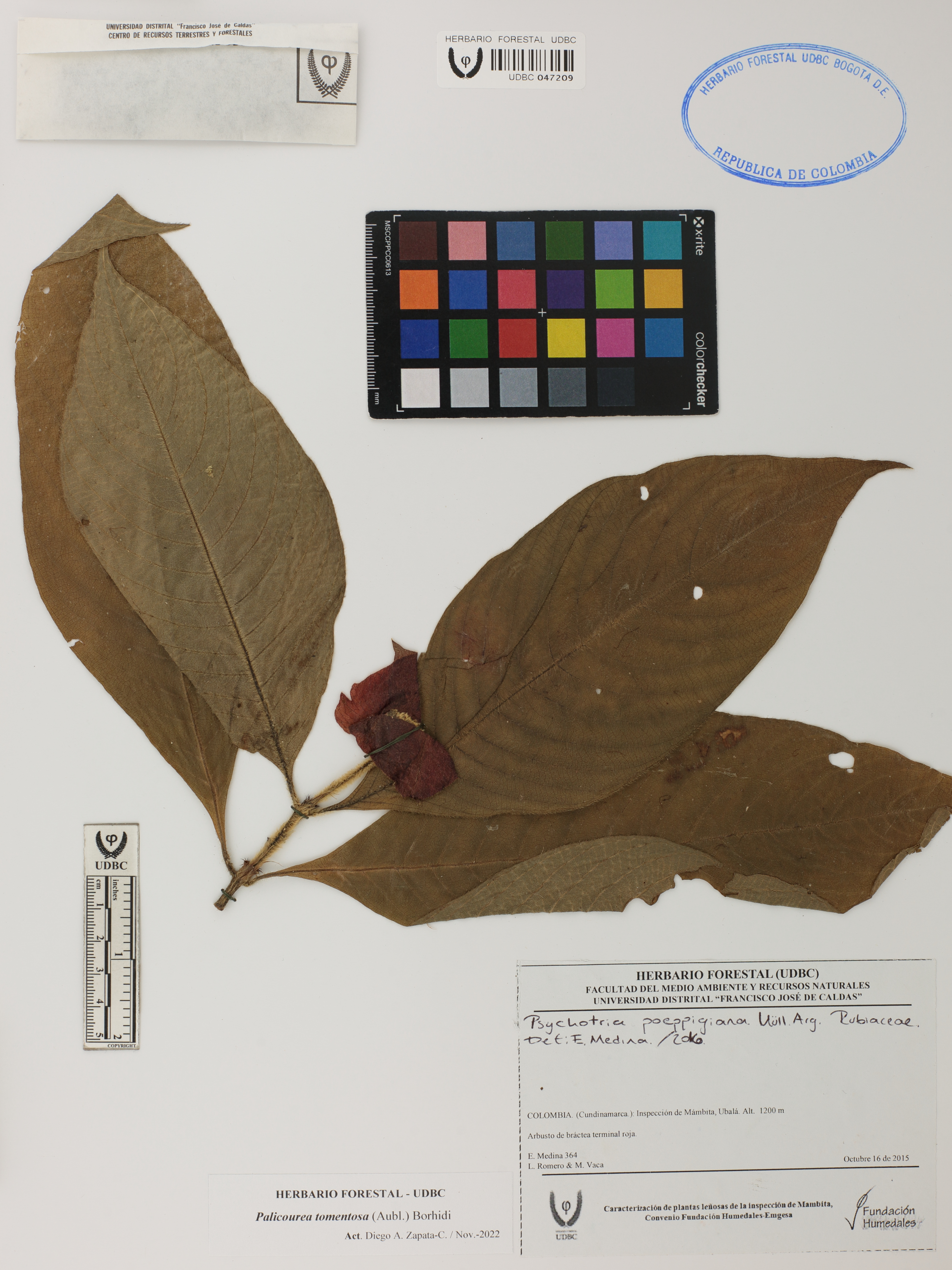 Fotografía del ejemplar Medina, E. 364, determinado como Palicourea tomentosa en el año 2016