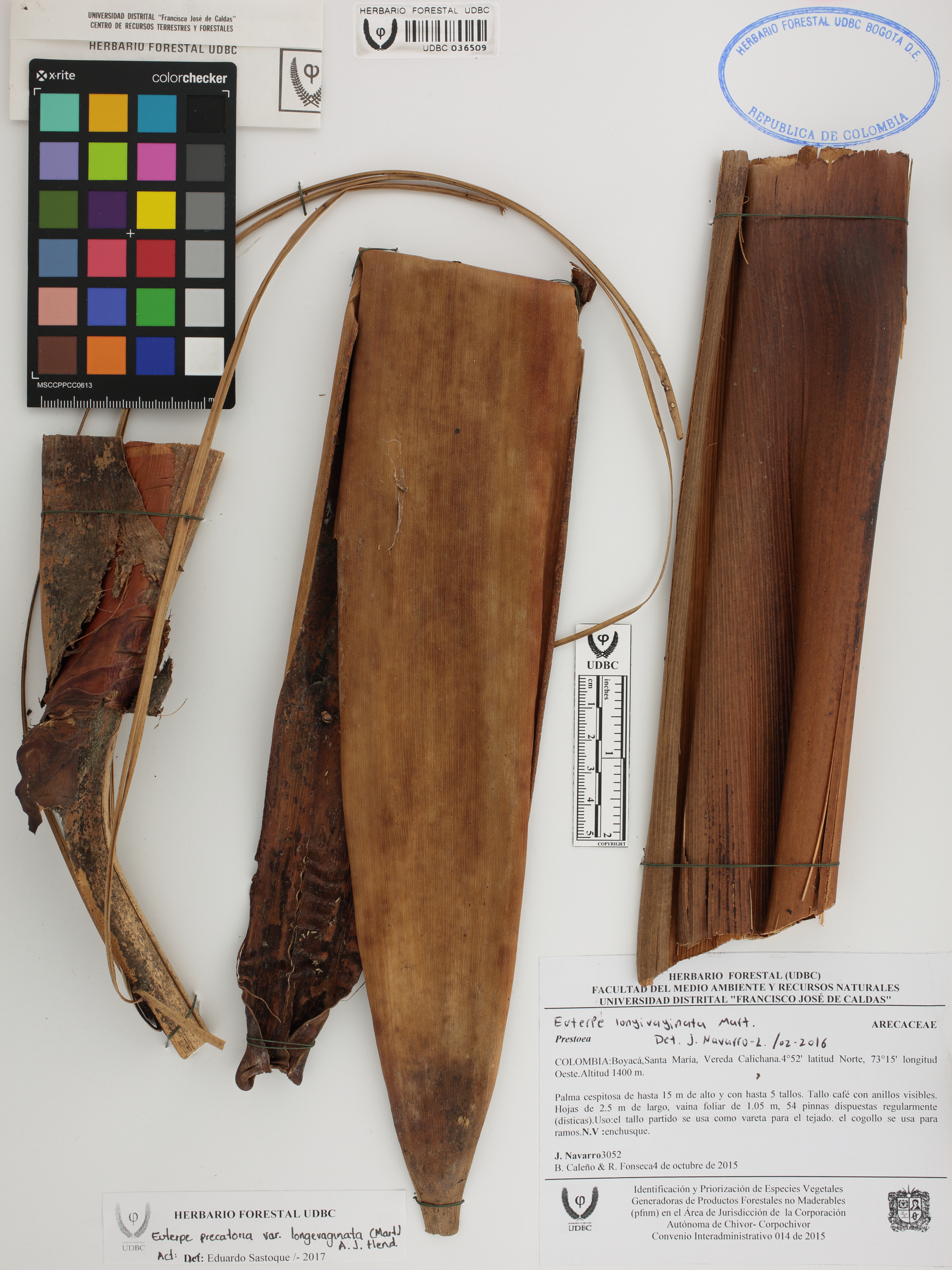 Fotografía del ejemplar Navarro, J. 3052, determinado como Euterpe longevaginata en el año 2016