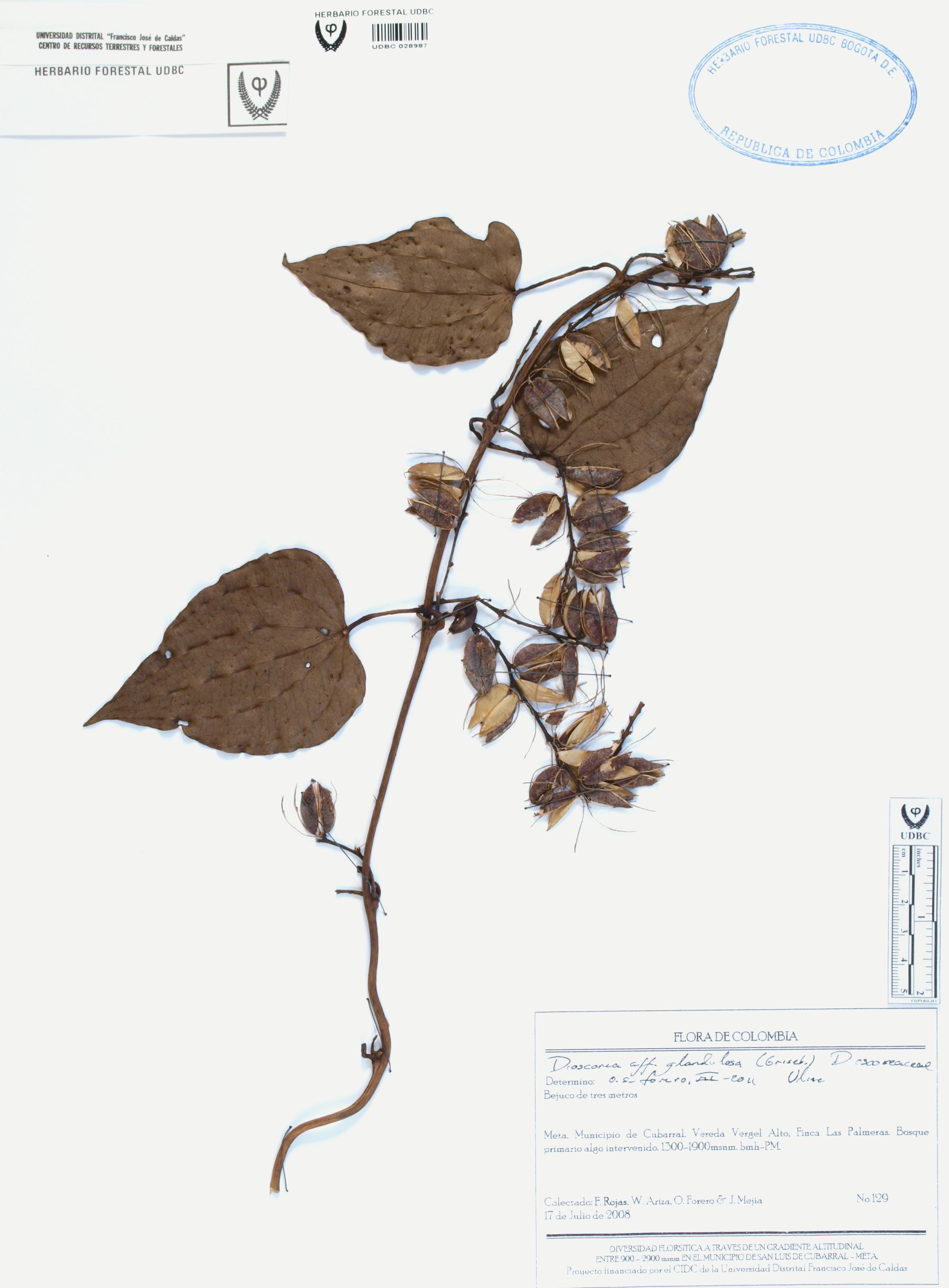 Fotografía del ejemplar Rojas, F. 129, determinado como Dioscorea glandulosa en el año 2011
