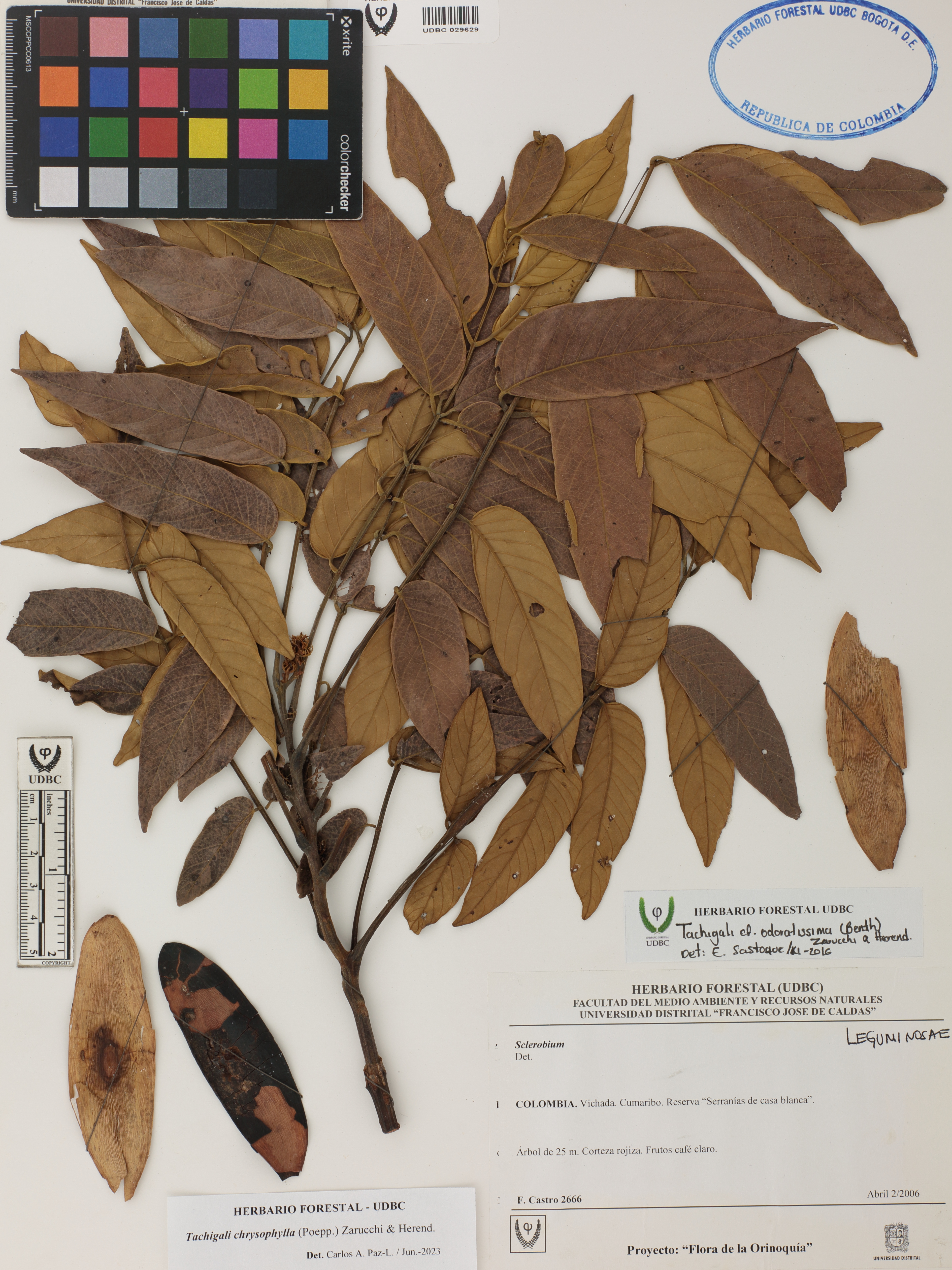 Fotografía del ejemplar Castro, F. 2666, determinado como Tachigali chrysophylla en el año 2023