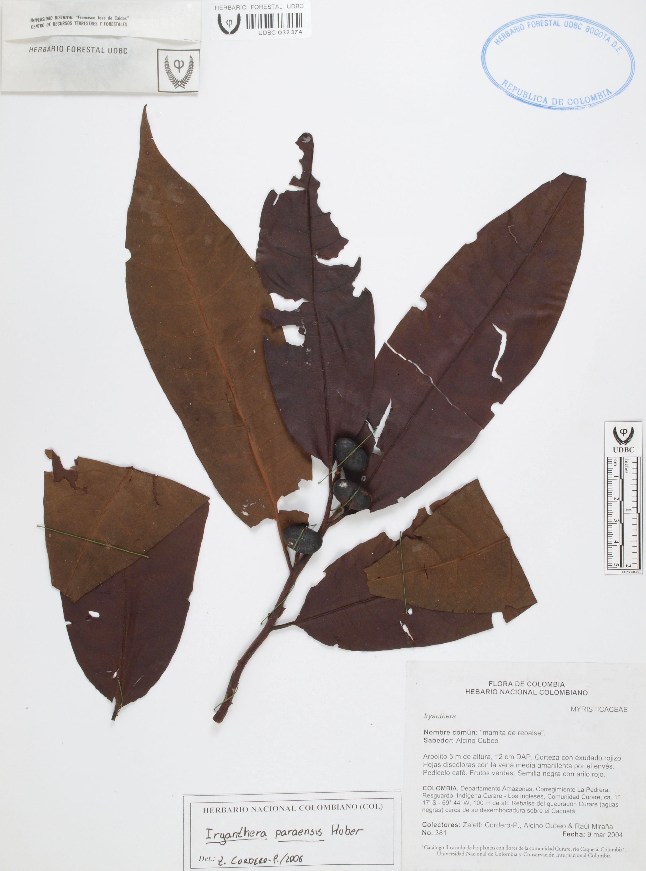 Fotografía del ejemplar Cordero-P., Z. 381, determinado como Iryanthera paraensis en el año 2006