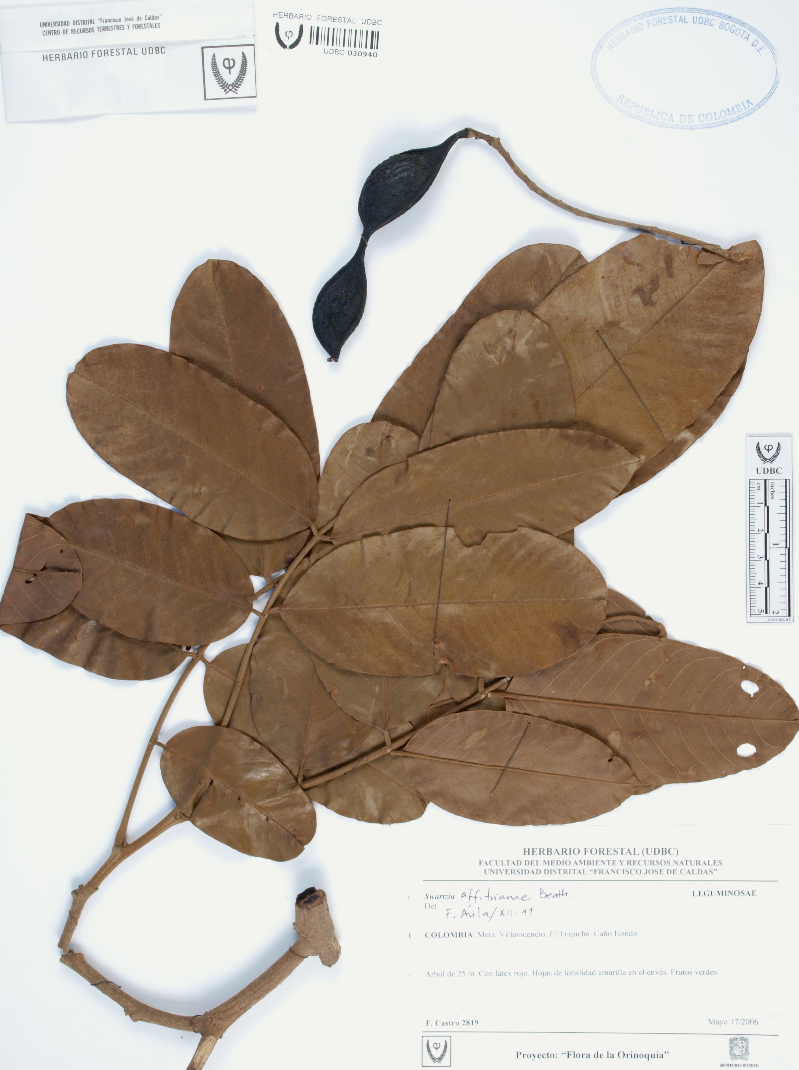 Fotografía del ejemplar Castro, F. 2819, determinado como Swartzia trianae en el año 2011