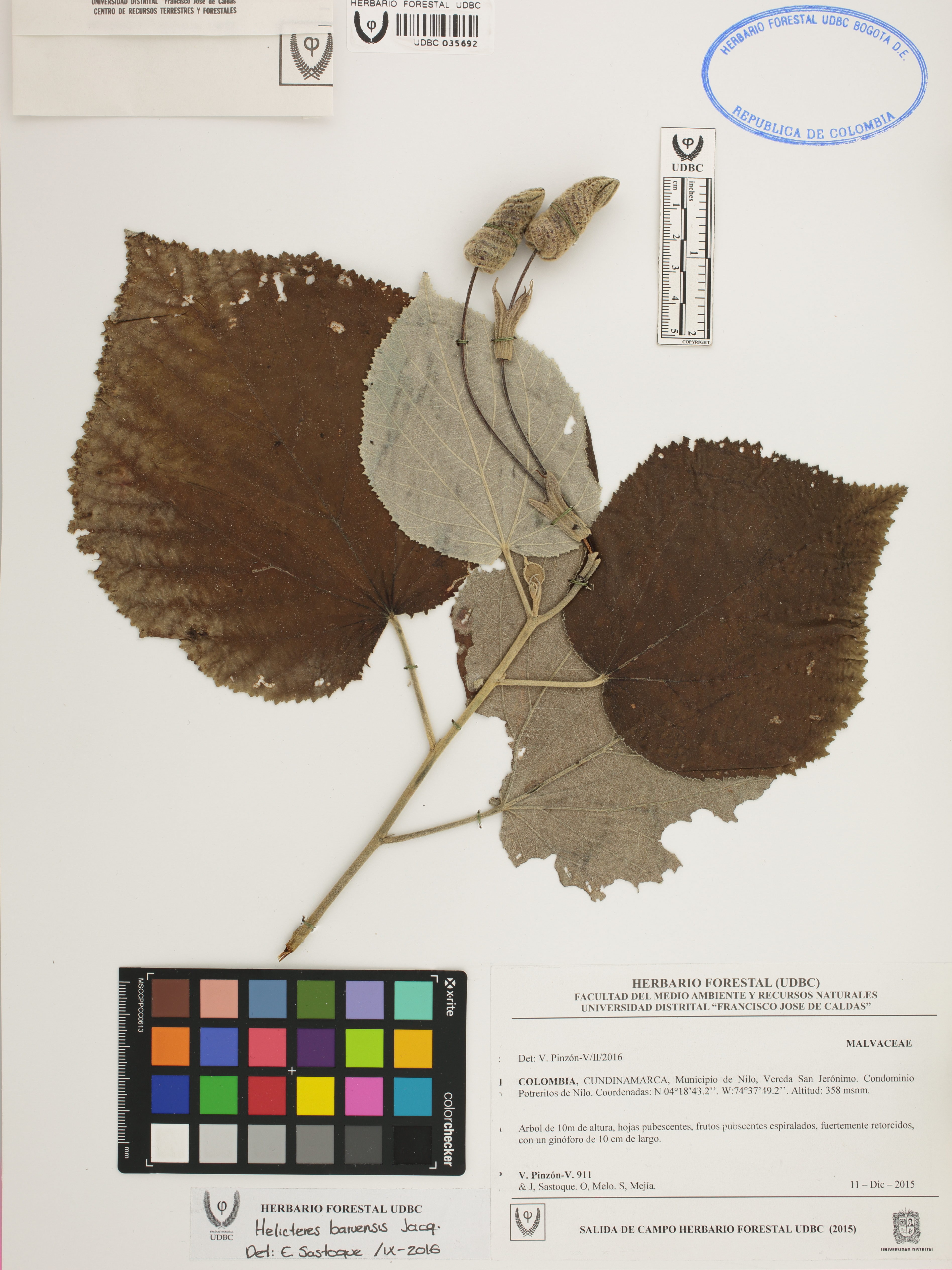 | dc.description | Fotografía del ejemplar Pinzón-V., V. 911, determinado como Helicteres baruensis en el año 2016 | |