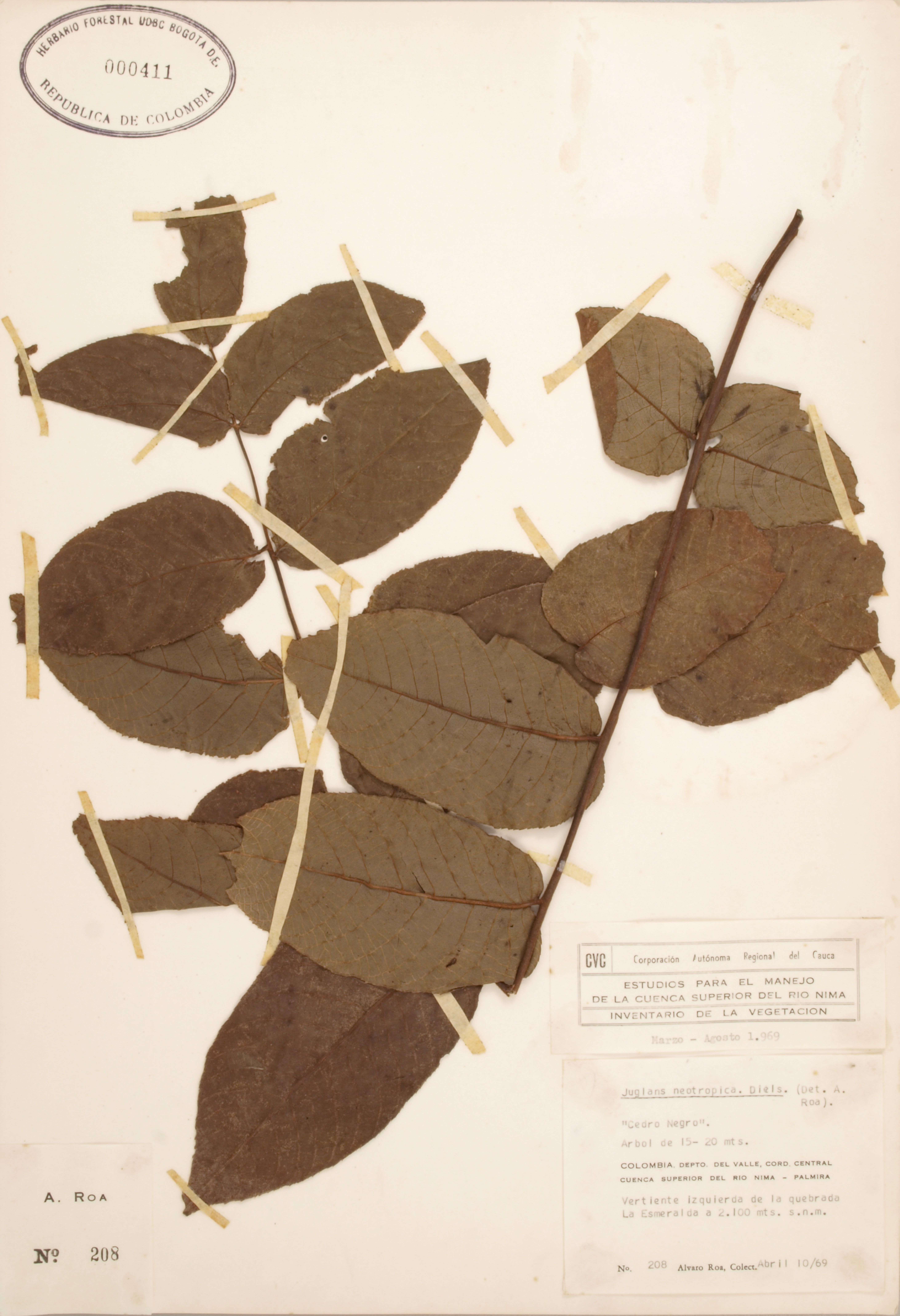 Fotografía del ejemplar Roa, A. 208, determinado como Juglans neotropica en el año 1969
