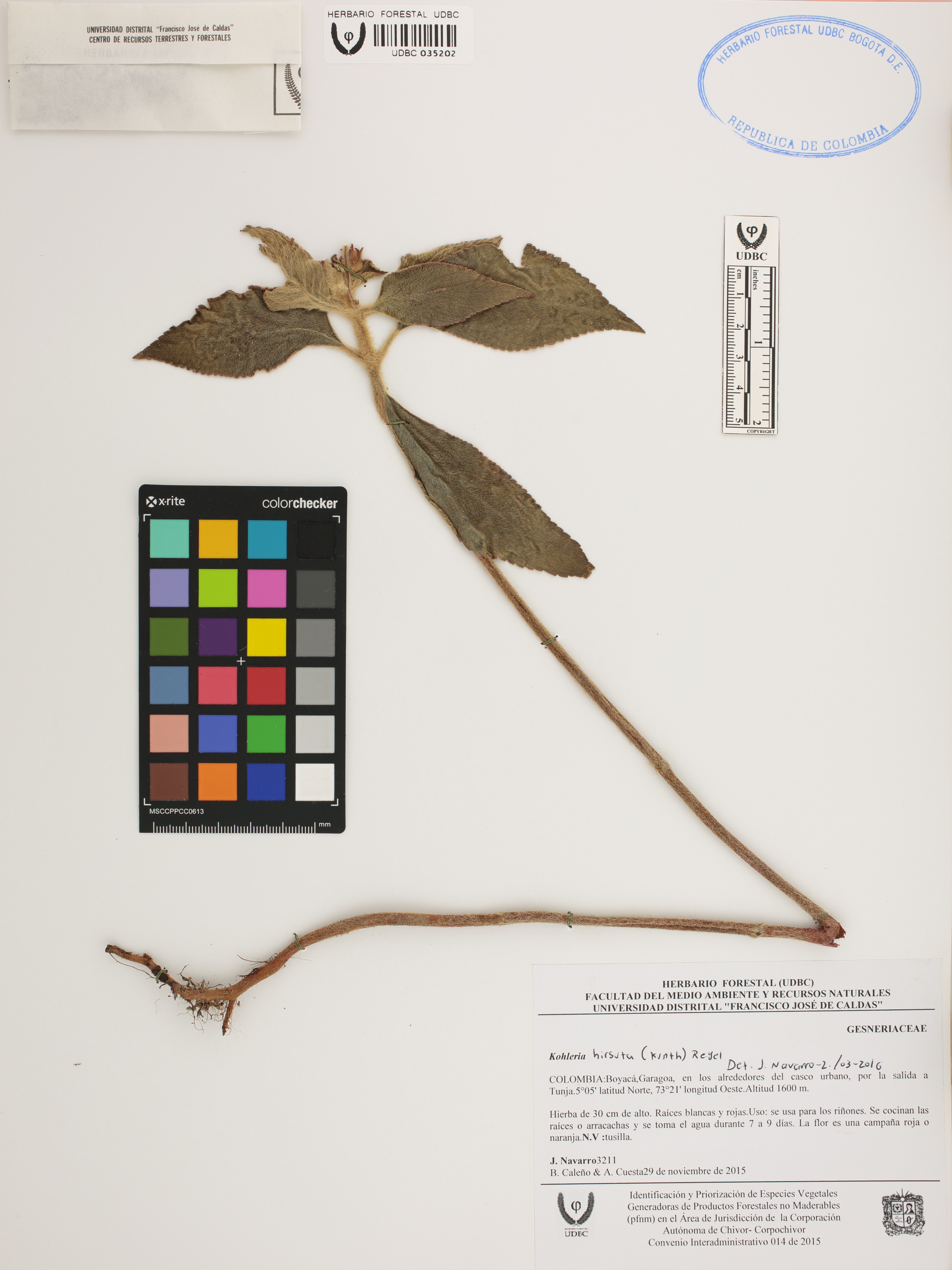 Fotografía del ejemplar Navarro, J. 3211, determinado como Kohleria hirsuta en el año 2016