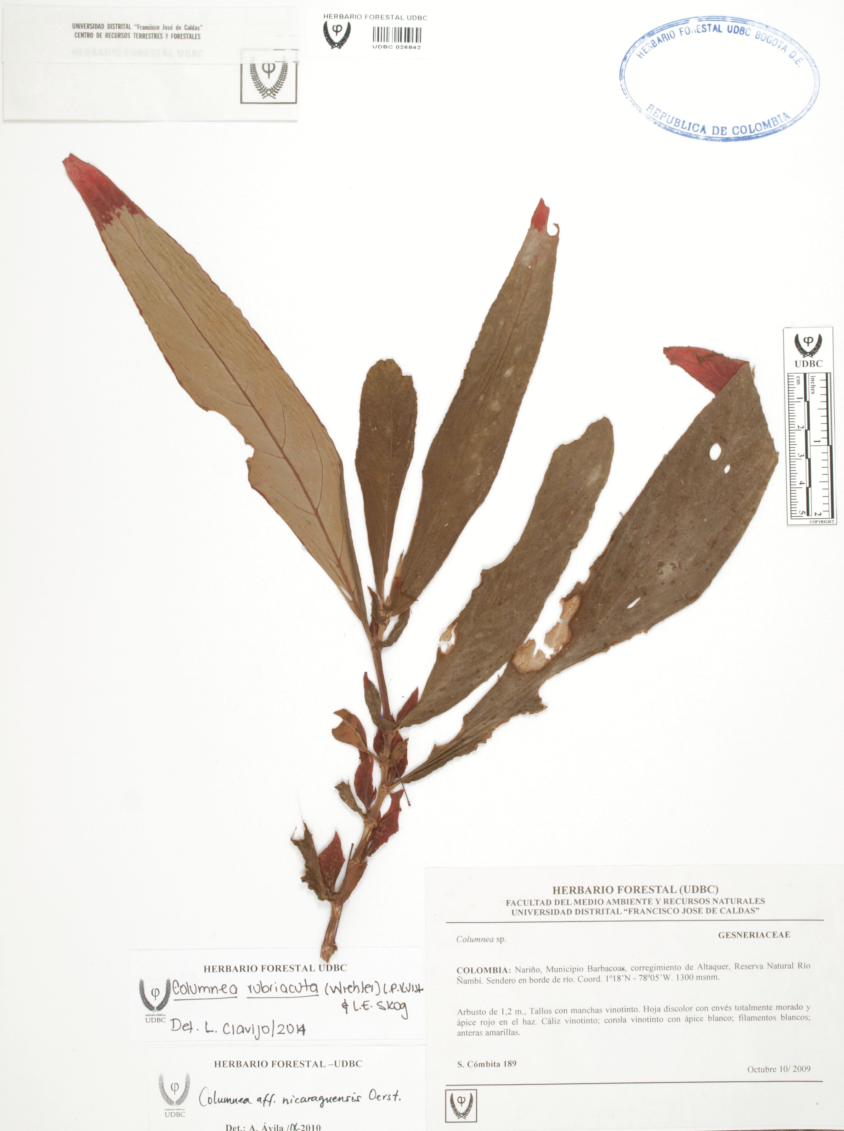 Fotografía del ejemplar Cómbita, S. 189, determinado como Columnea rubriacuta en el año 2014