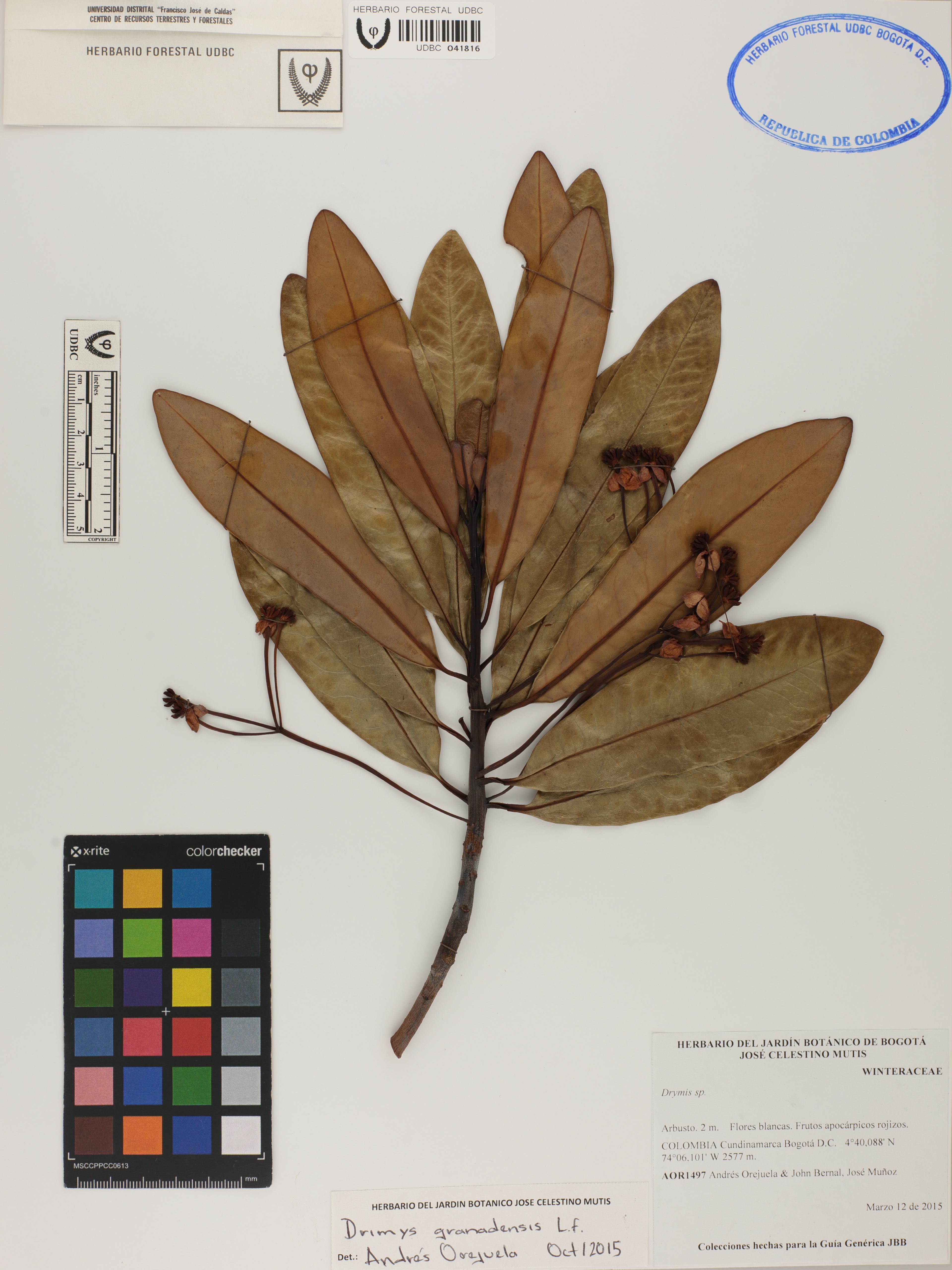 Fotografía del ejemplar Orejuela, A. 1497, determinado como Drimys granadensis en el año 2015