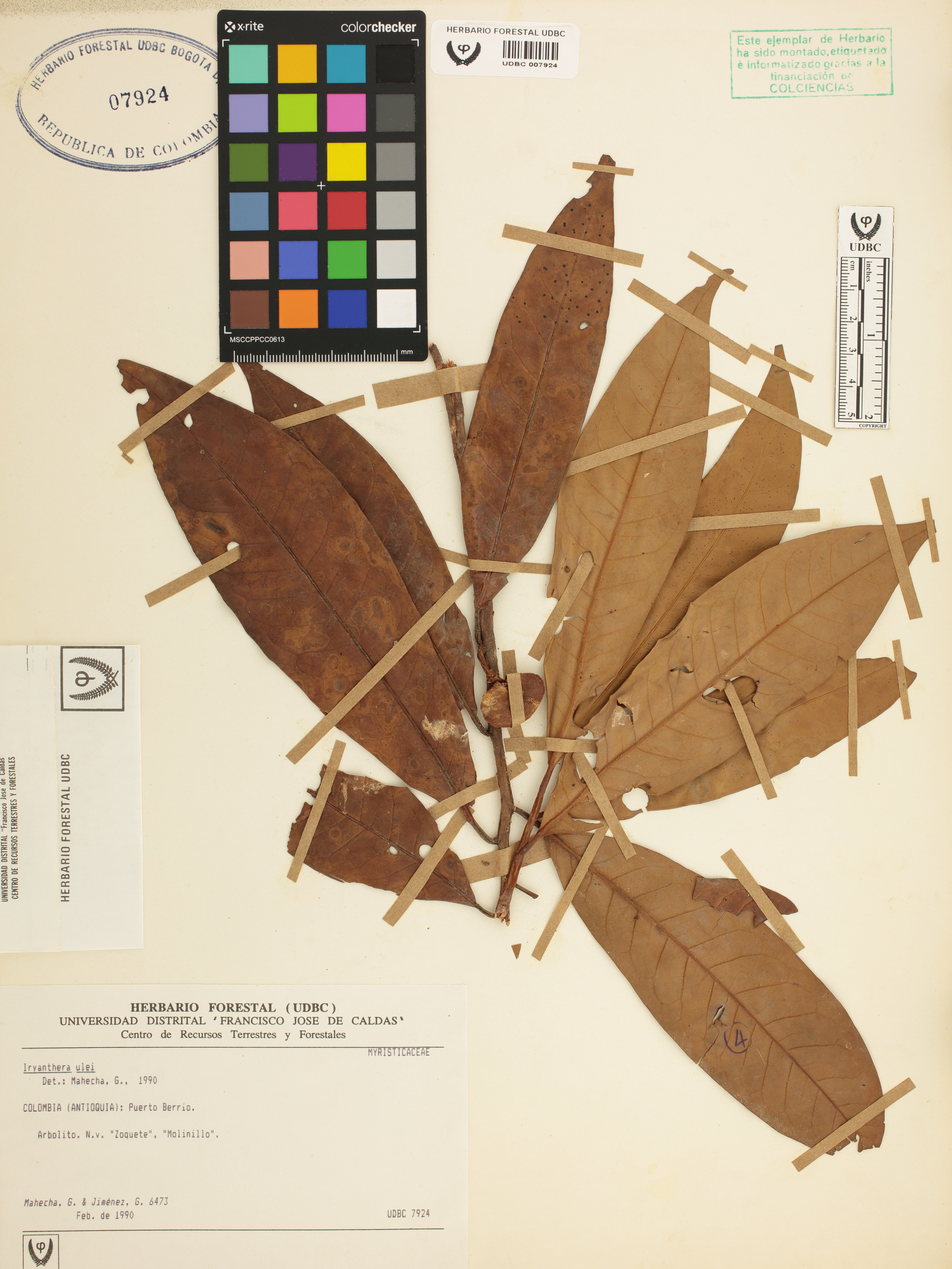 Fotografía del ejemplar Mahecha, G. 6473, determinado como Iryanthera hostmannii en el año 1990
