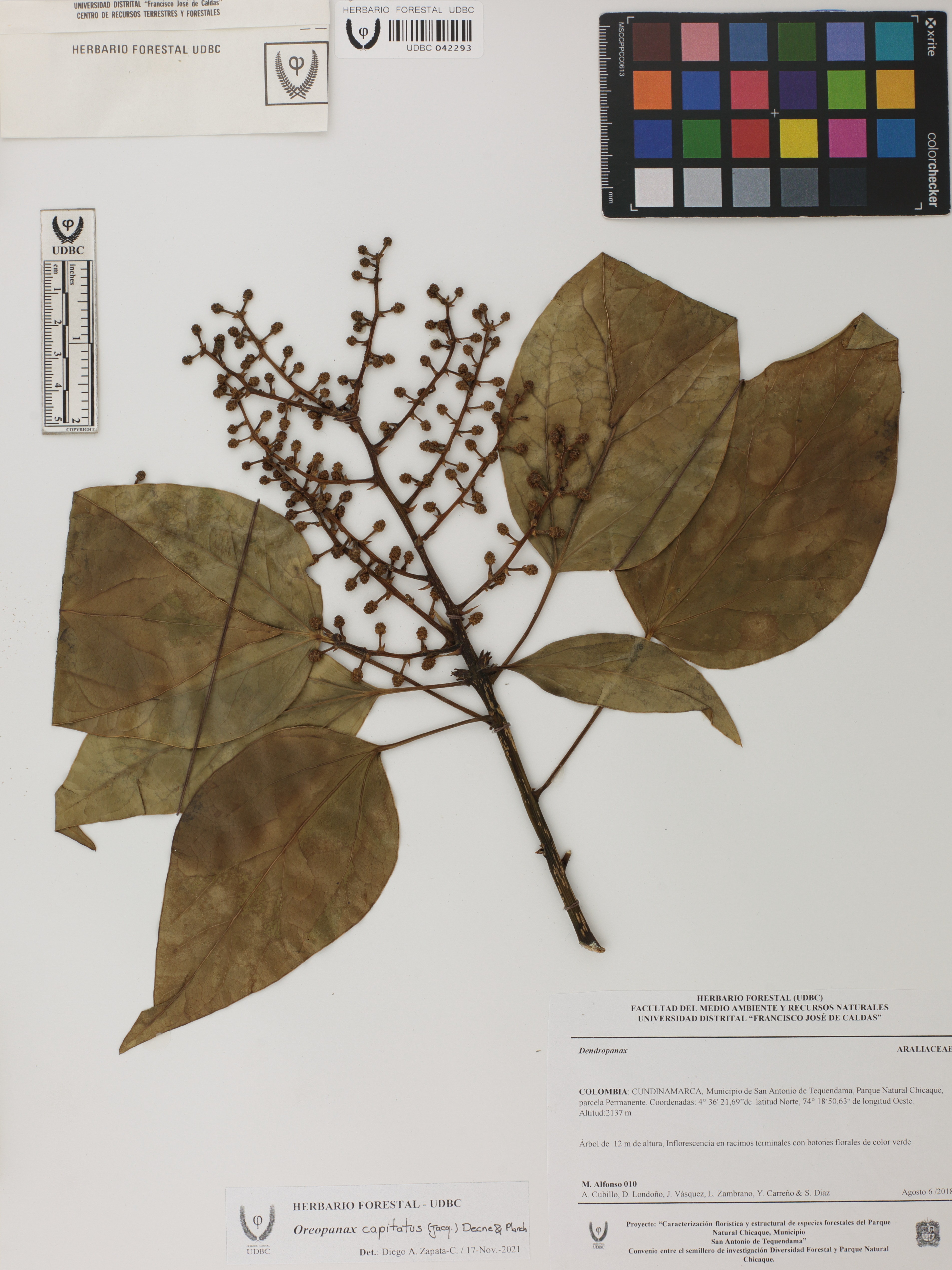 Fotografía del ejemplar Alfonso, M. 10, determinado como Oreopanax capitatus en el año 2021