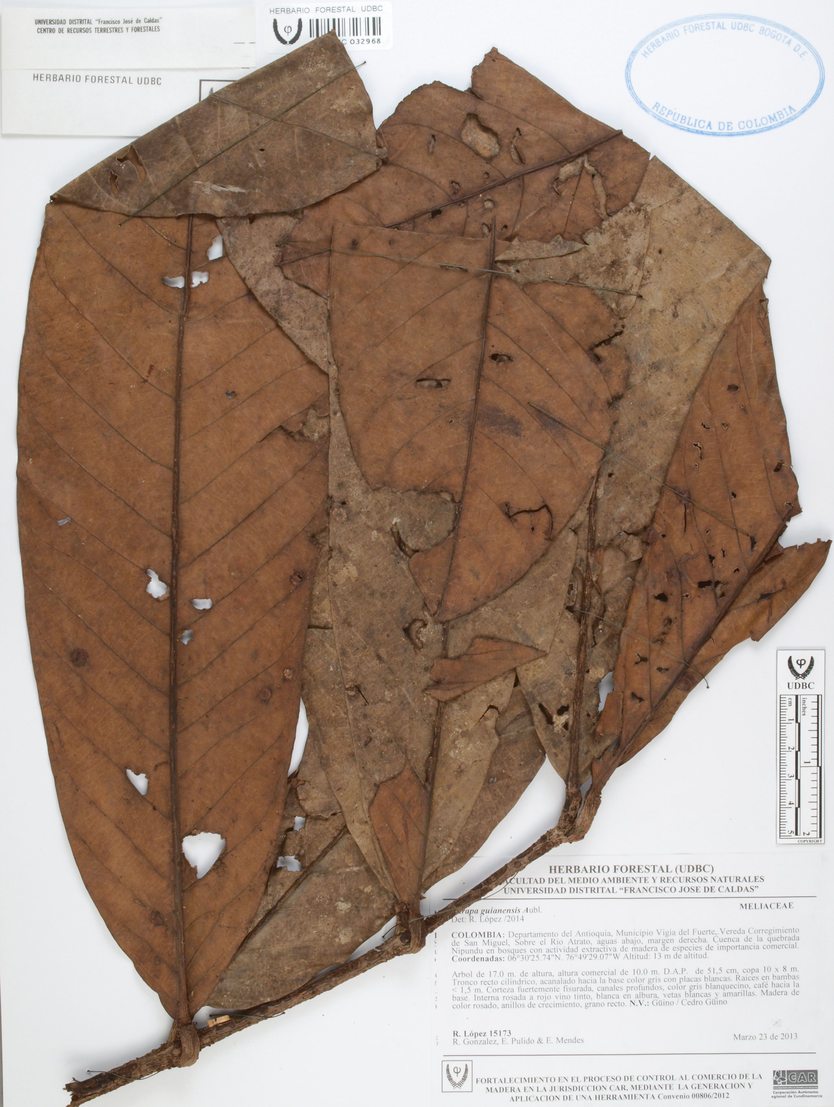 Fotografía del ejemplar López, R. 15173, determinado como Carapa guianensis en el año 2014