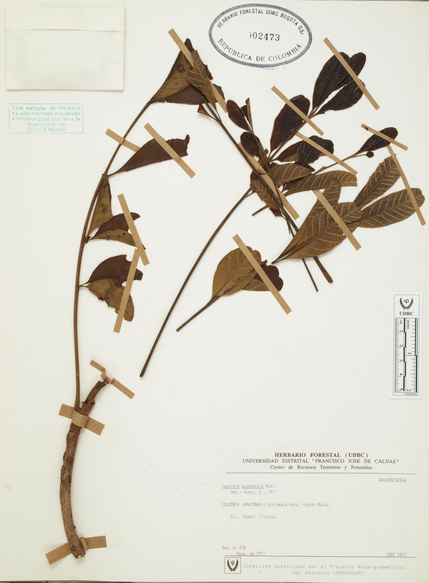 Fotografía del ejemplar Roa, A. 578, determinado como Tapirira guianensis en el año 1977