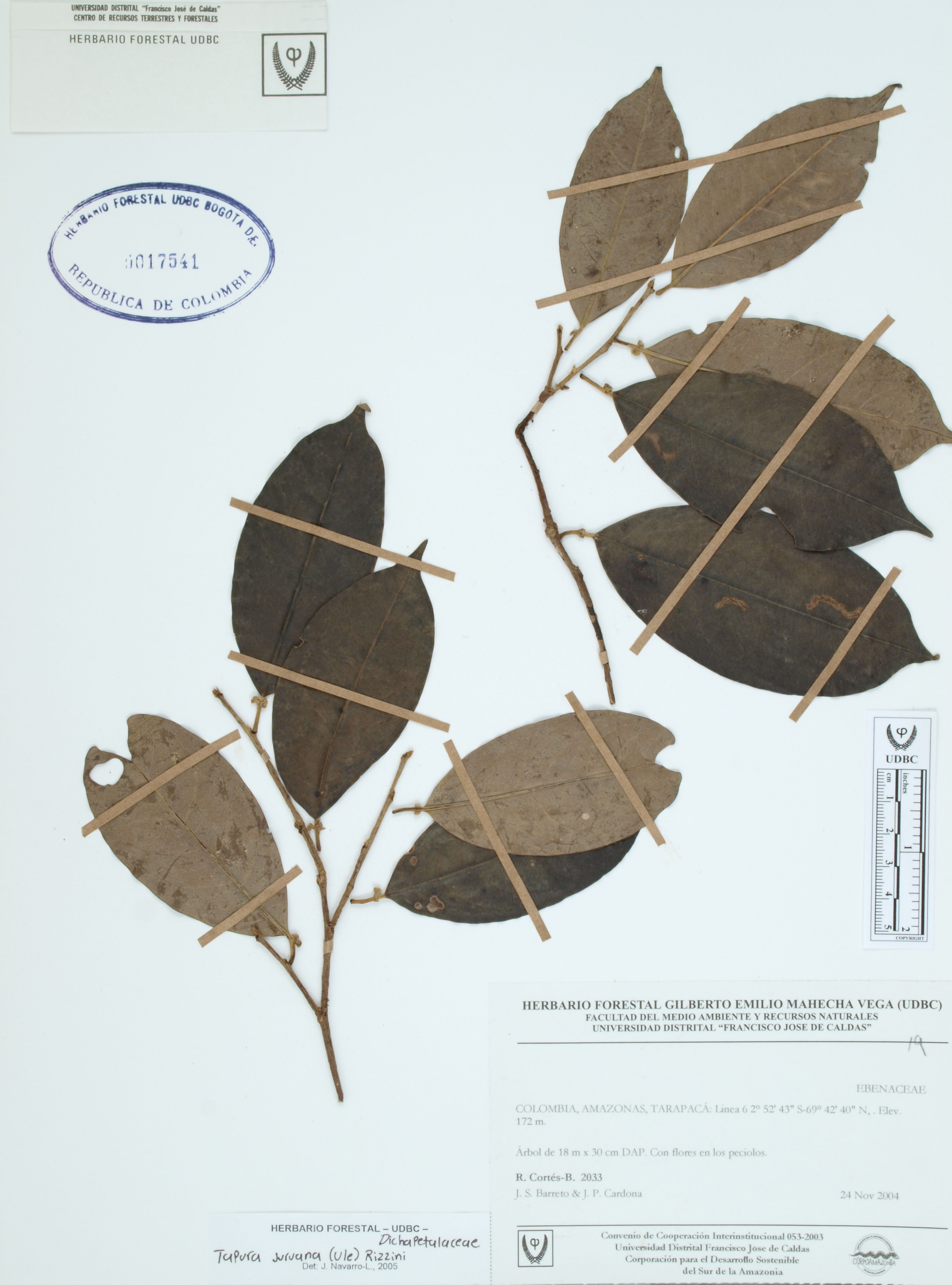 Fotografía del ejemplar Cortés-B., R. 2033, determinado como Tapura juruana en el año 2005