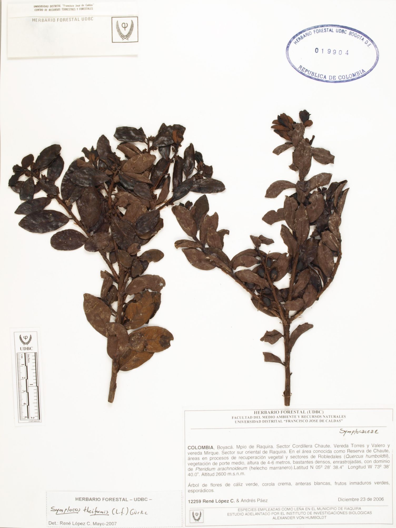 Fotografía del ejemplar López, R. 12259, determinado como Symplocos theiformis en el año 2007