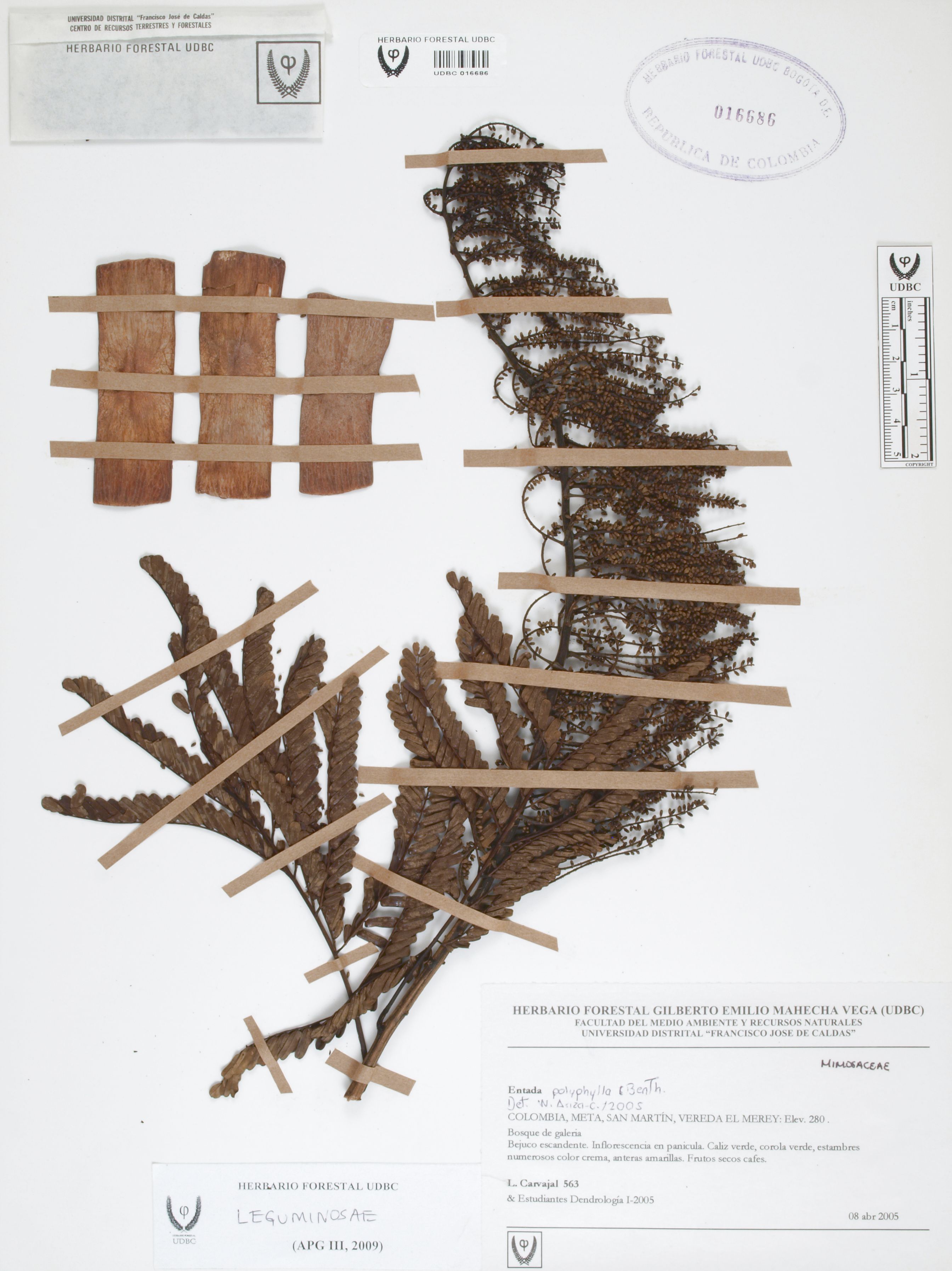 Fotografía del ejemplar Carvajal, L. 563, determinado como Entada polyphylla en el año 2005