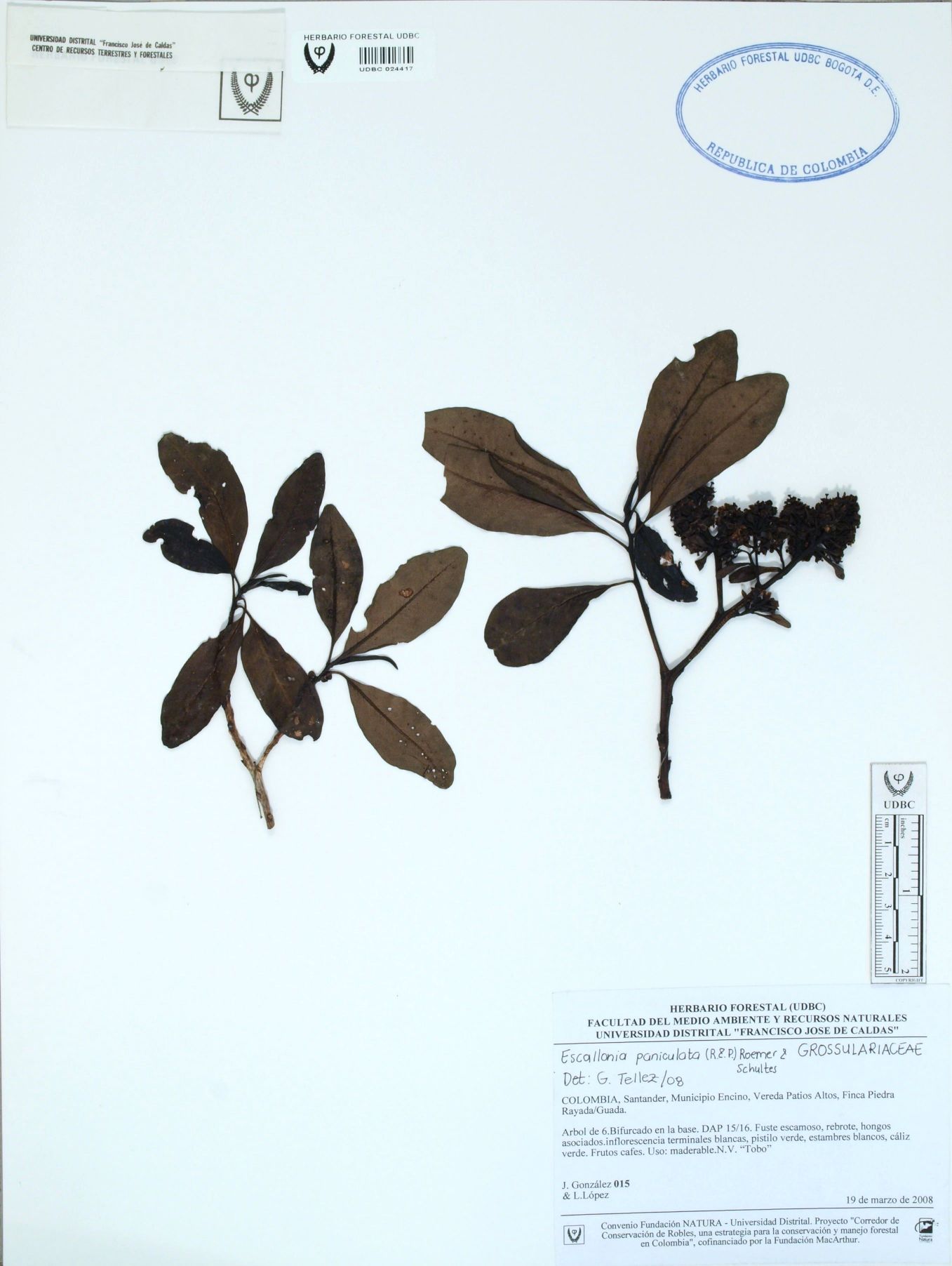 Fotografía del ejemplar González, J. 15, determinado como Escallonia paniculata en el año 2008