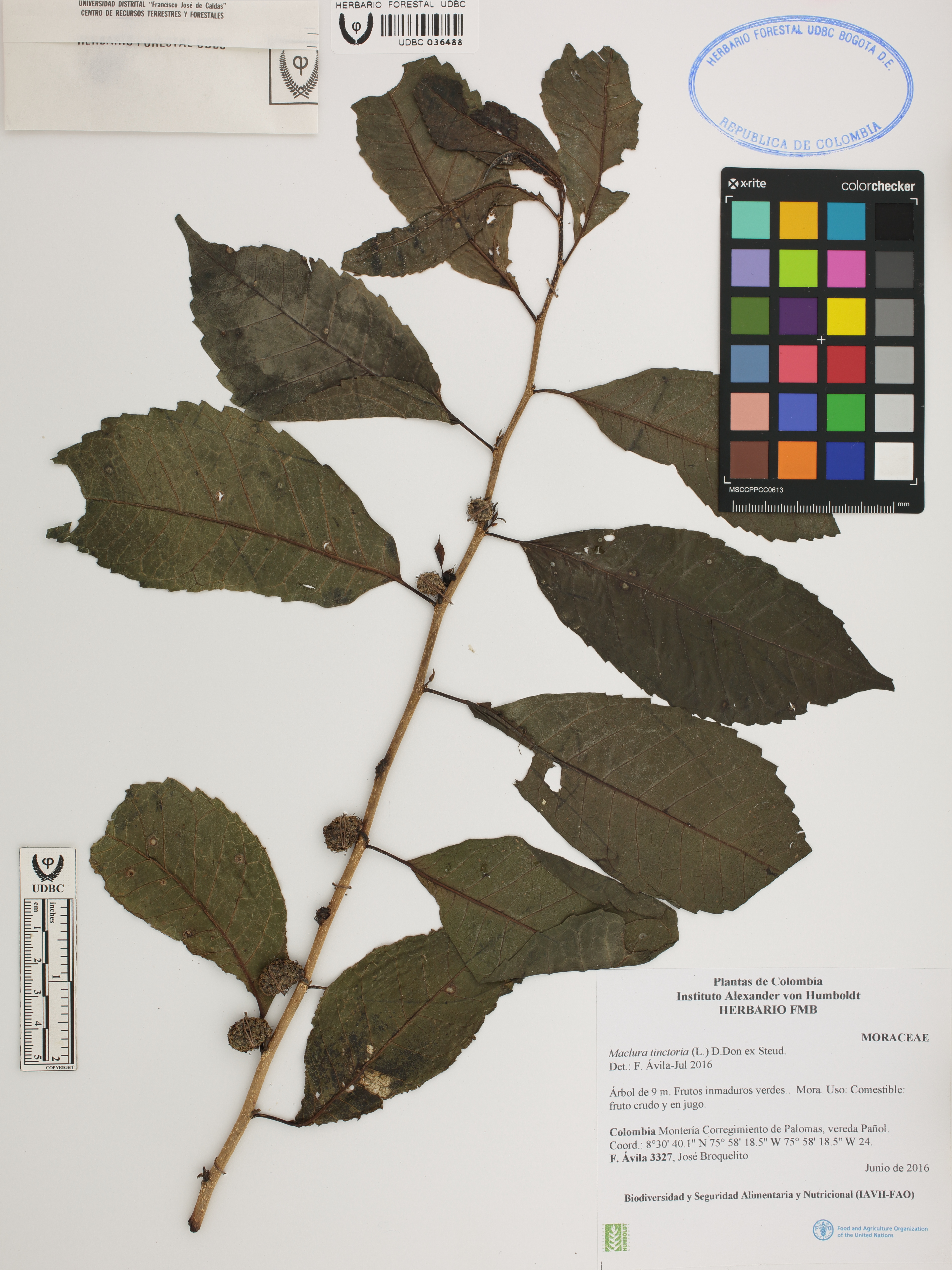 Fotografía del ejemplar Ávila, F. 3327, determinado como Maclura tinctoria en el año 2016