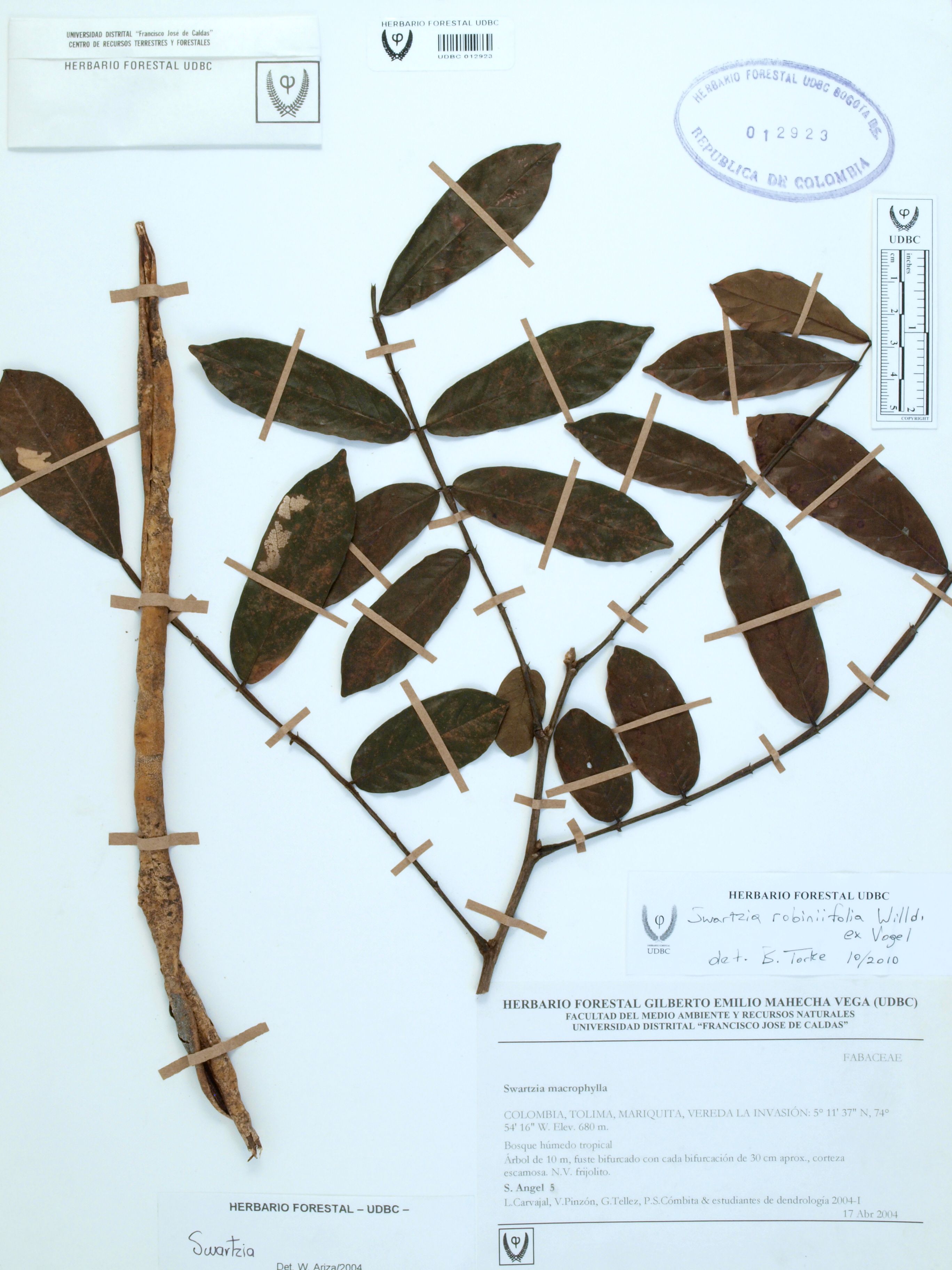 Fotografía del ejemplar Ángel, S. 5, determinado como Swartzia sp. en el año 2004
