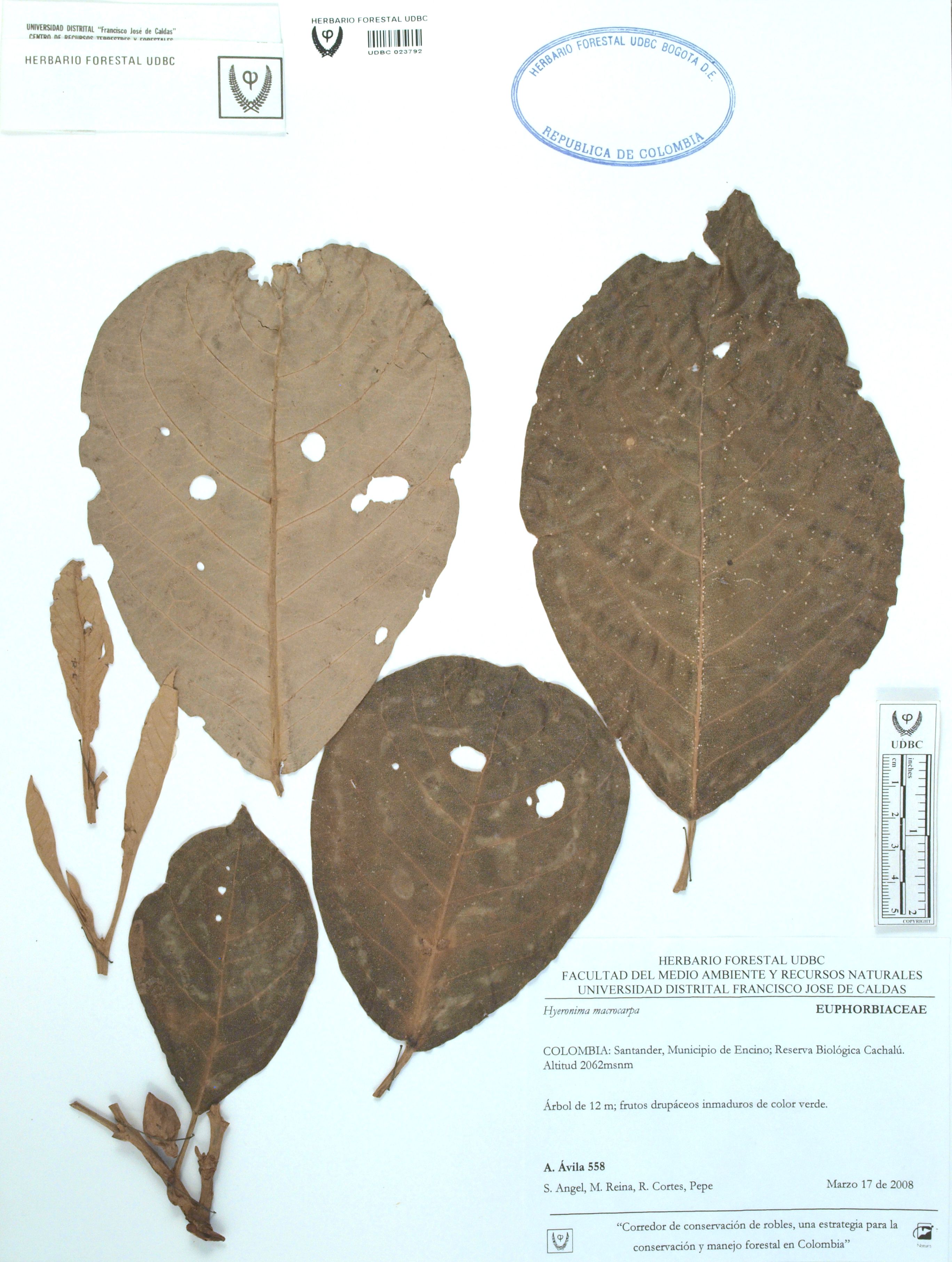 | dc.description | Fotografía del ejemplar Ávila, F. 558, determinado como Hieronyma macrocarpa | |
