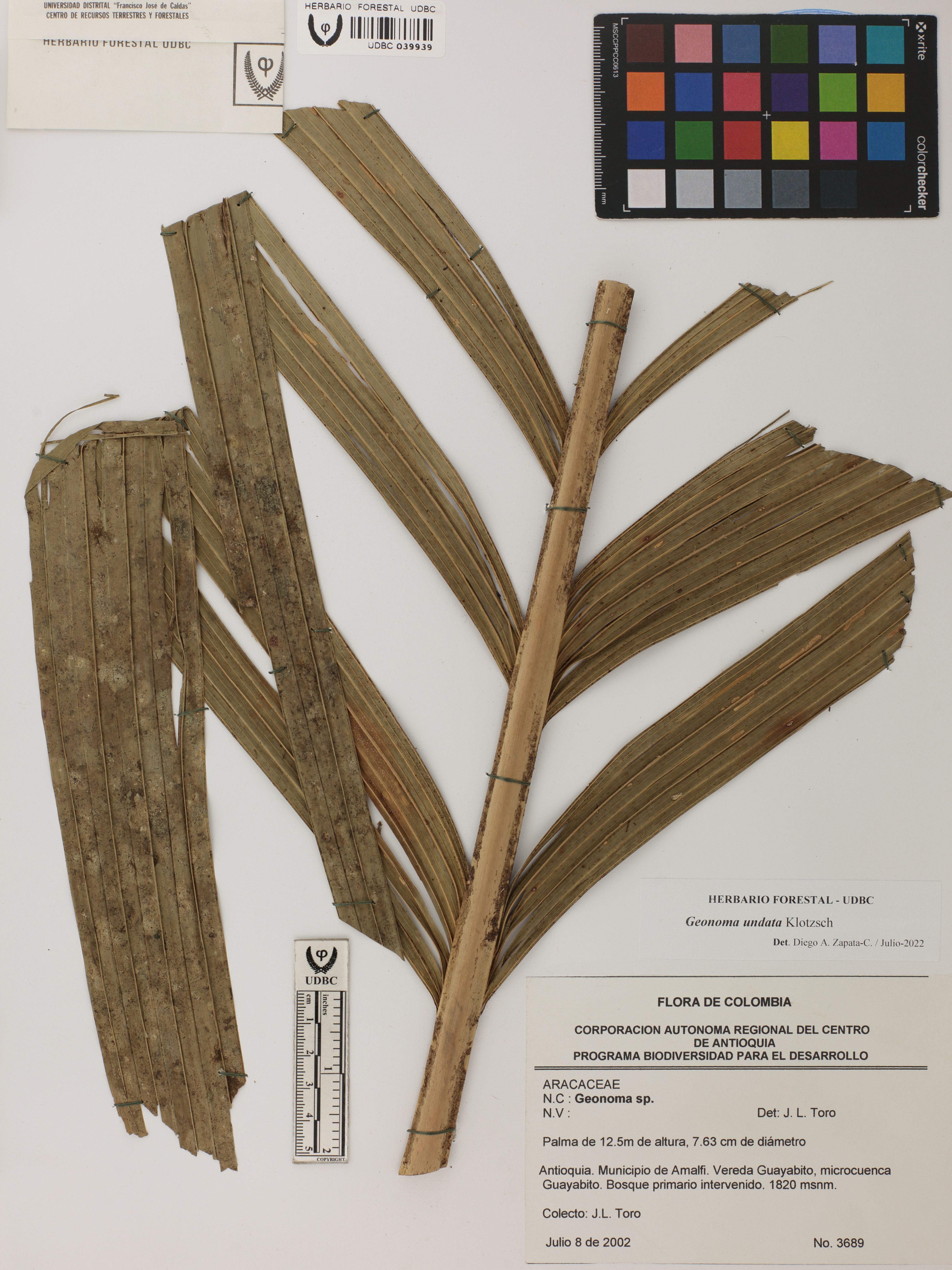 Fotografía del ejemplar Toro, J. 3689, determinado como Geonoma undata en el año 2022
