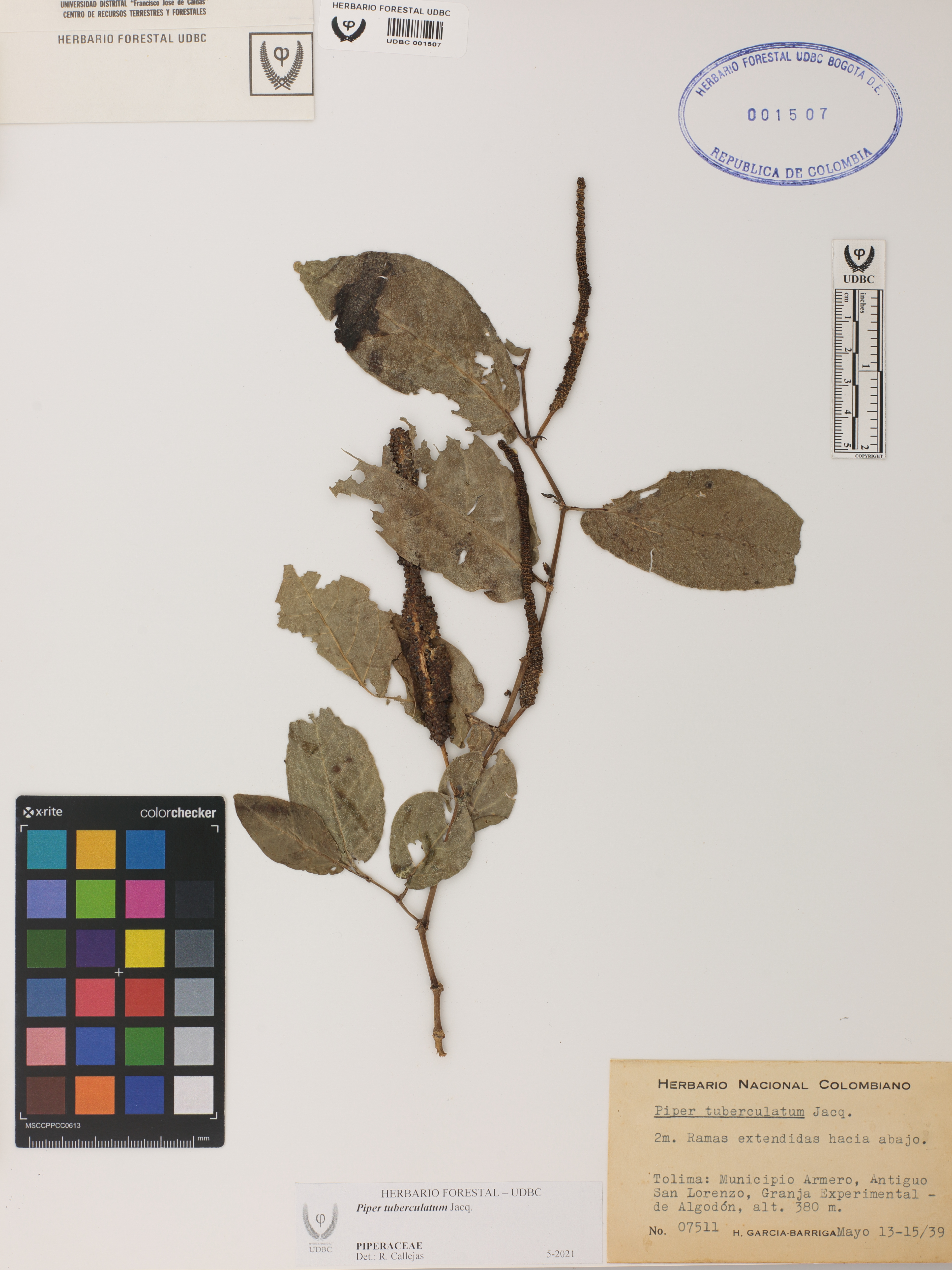Fotografía del ejemplar García-B., H. 7511, determinado como Piper tuberculatum en el año 2021