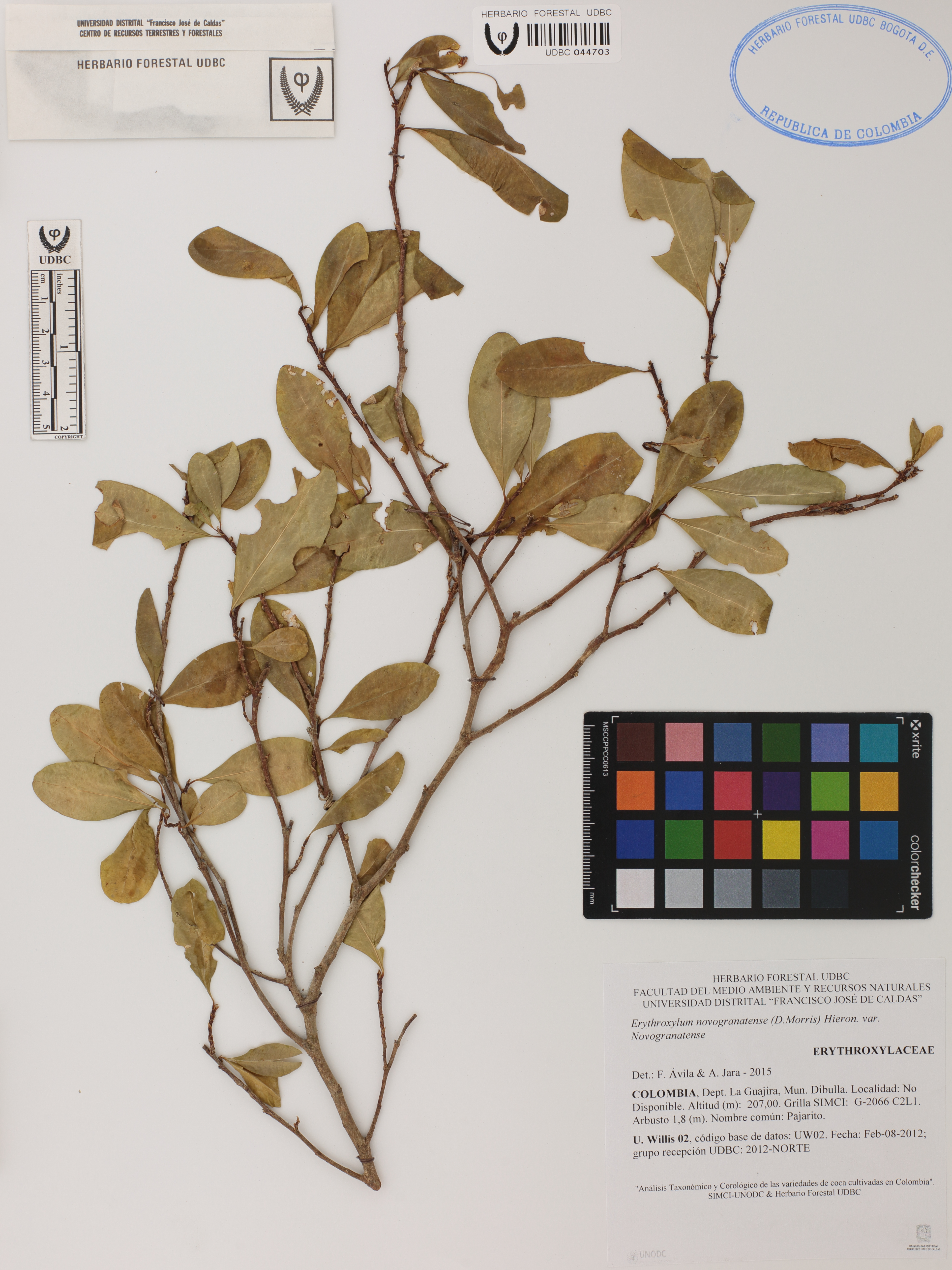 Fotografía del ejemplar Willis, U. 2, determinado como Erythroxylum novogranatense var. novogranatense en el año 2015