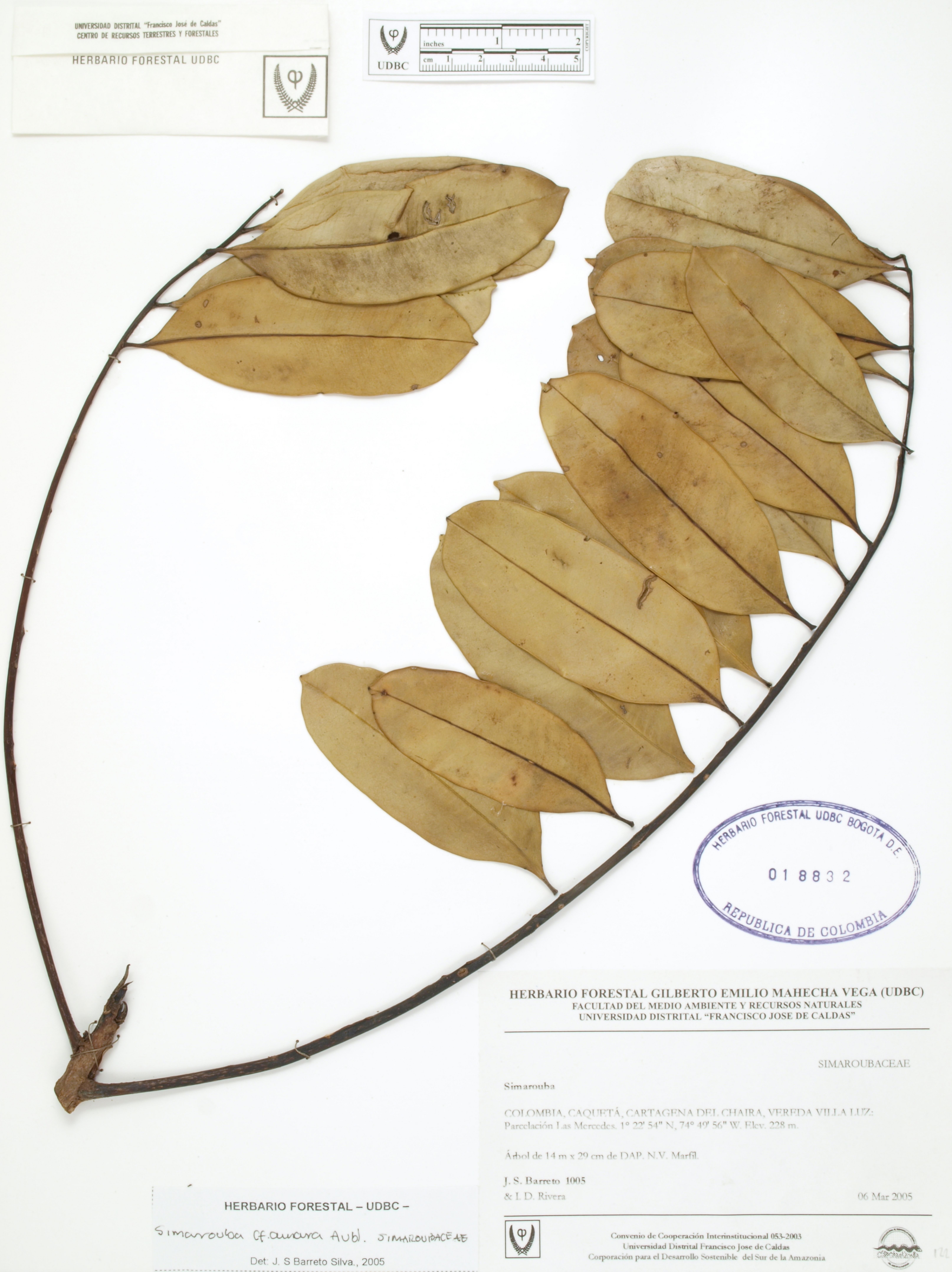Fotografía del ejemplar Barreto, J. 1005, determinado como Simarouba amara en el año 2005